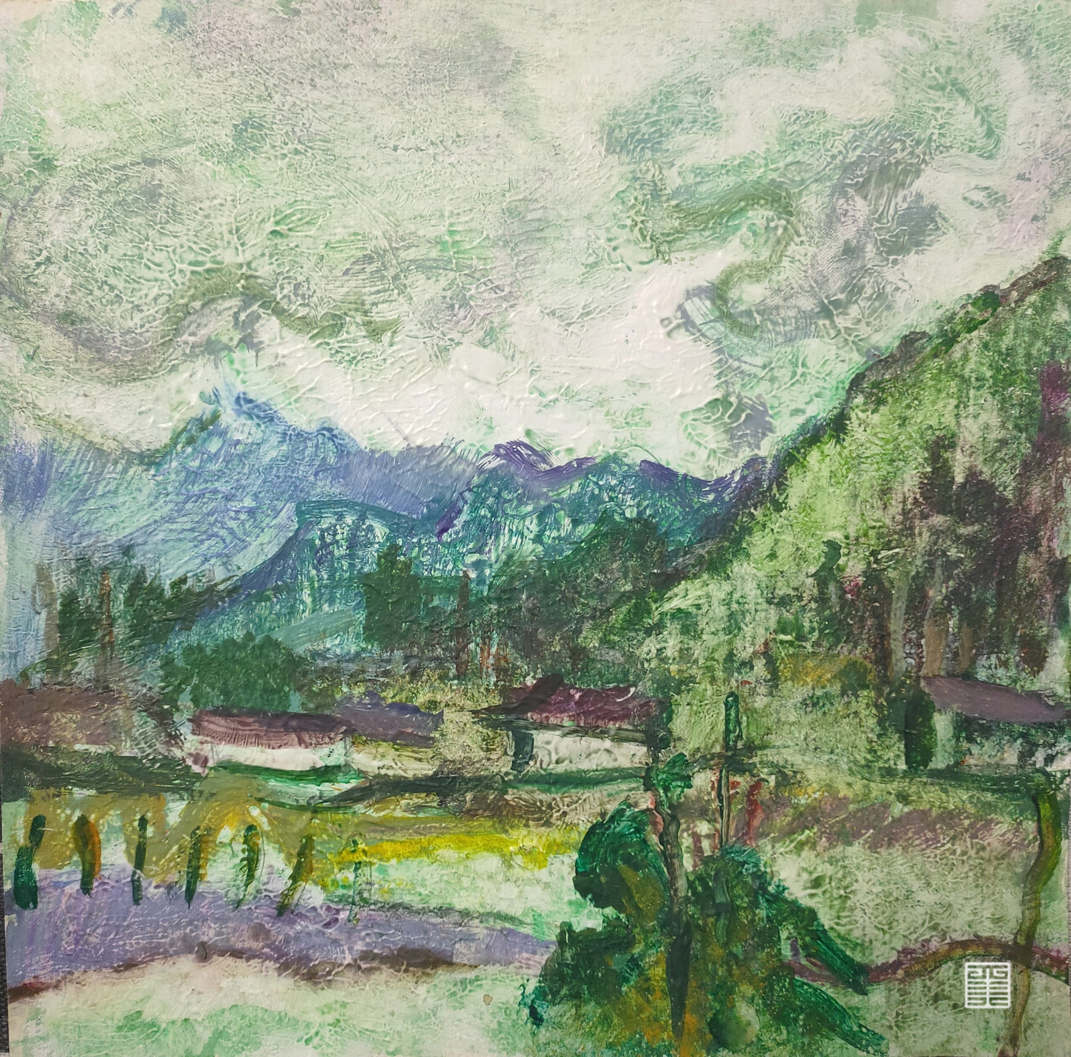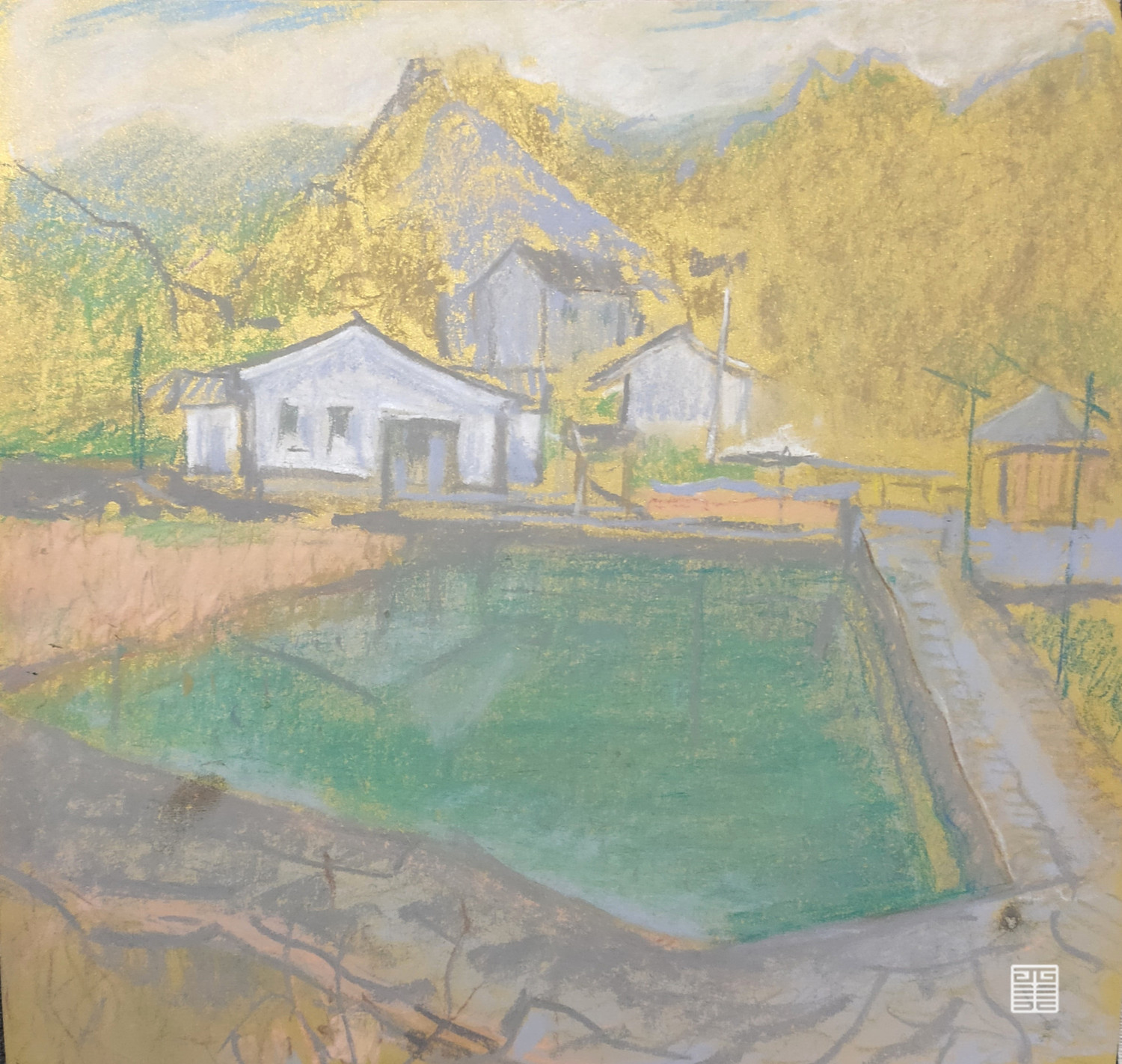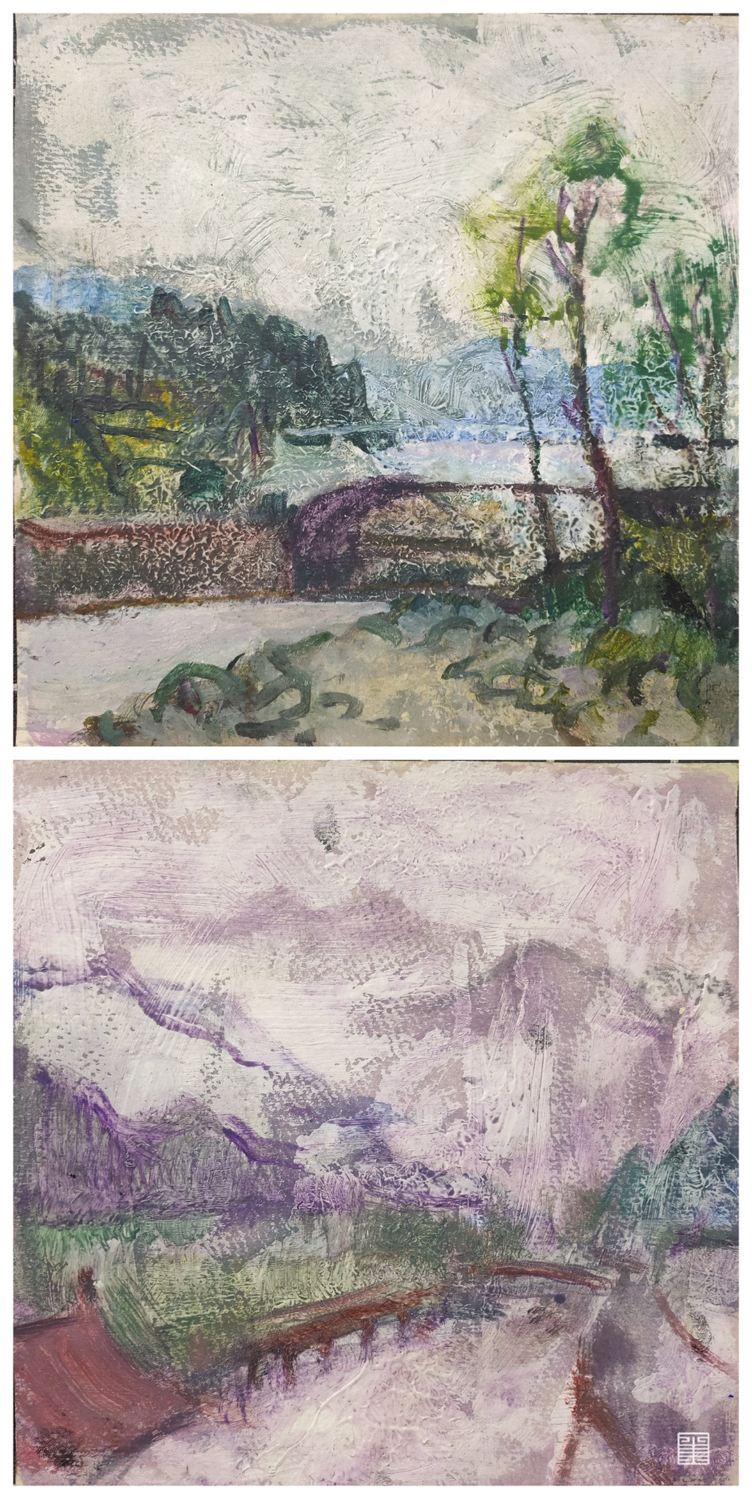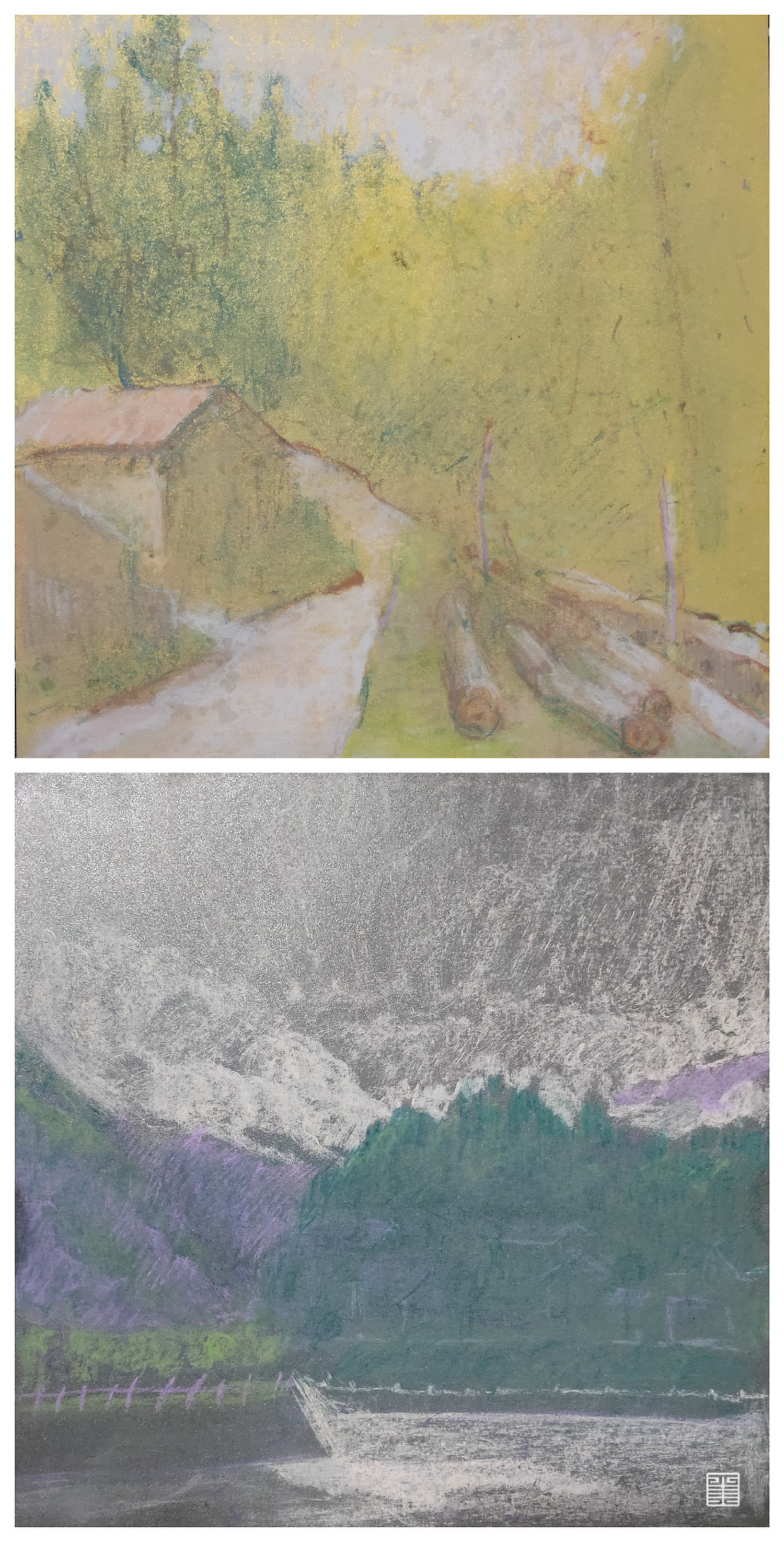 本次写生携带了多种材料进了大量的尝试,其中一些使用了树脂做出随机的肌理效果,在之上用水彩作画,借用其有意无意产生的肌理纹路,增加了画面的丰富性和厚重感,同时着力表达绘画意向感受,不断尝试寻找事物具象和感受直接的平衡,期望达到一种中国画式的写意之美。之外我还在画了一些色粉画,主要是解决一些色彩概括问题,通过对风景颜色造型的取舍更简单直观地表达出来。