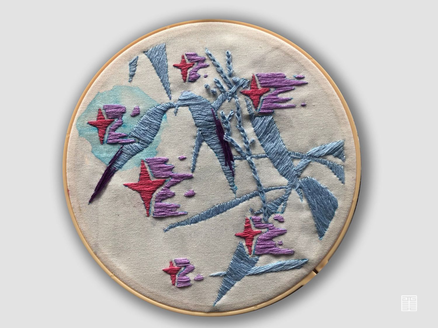 运用称成刺绣针法设计的刺绣图案,其中运用了平针、回针和打籽三种针法。