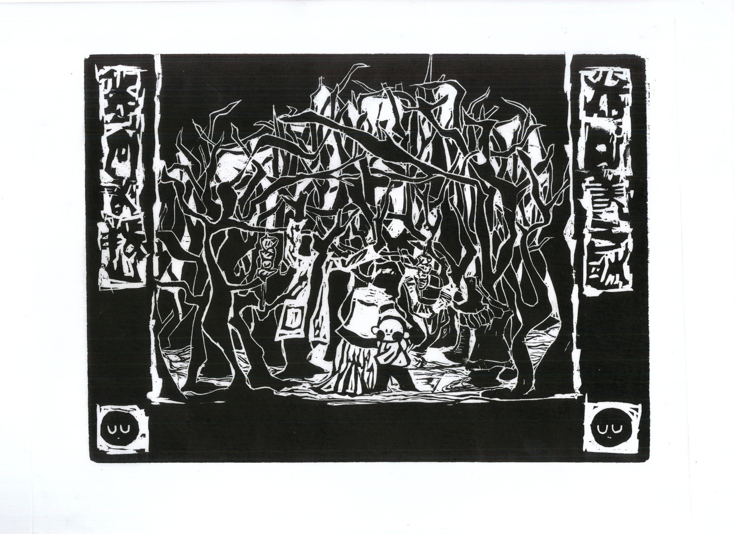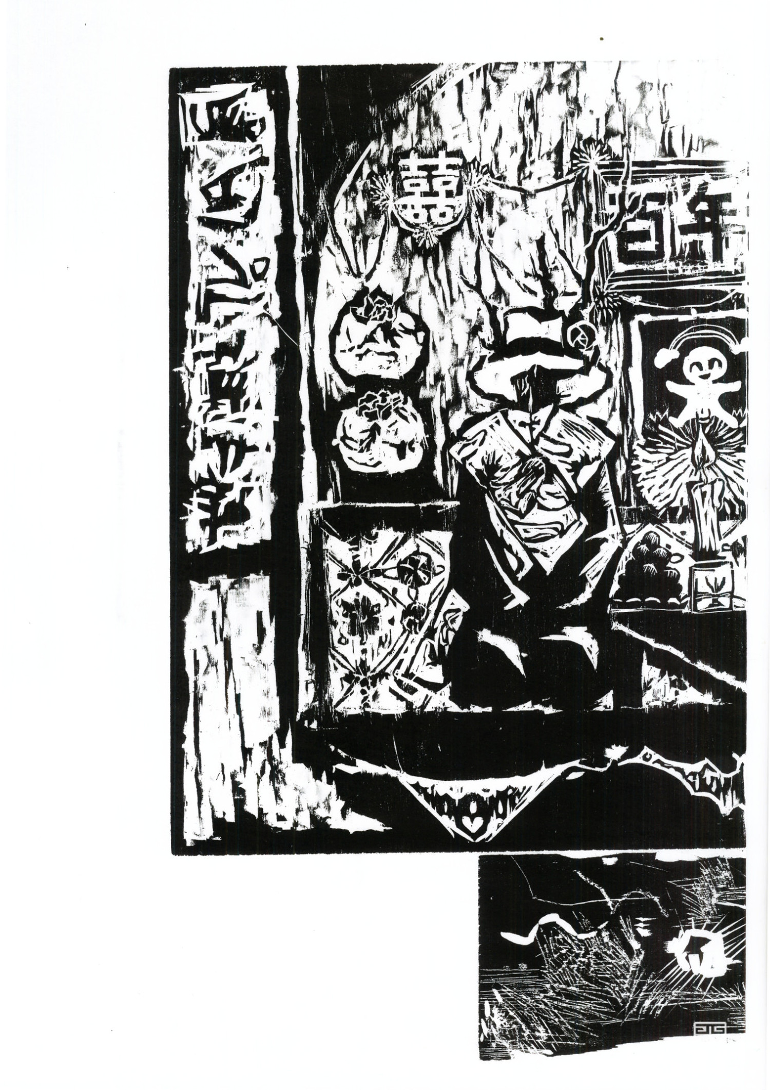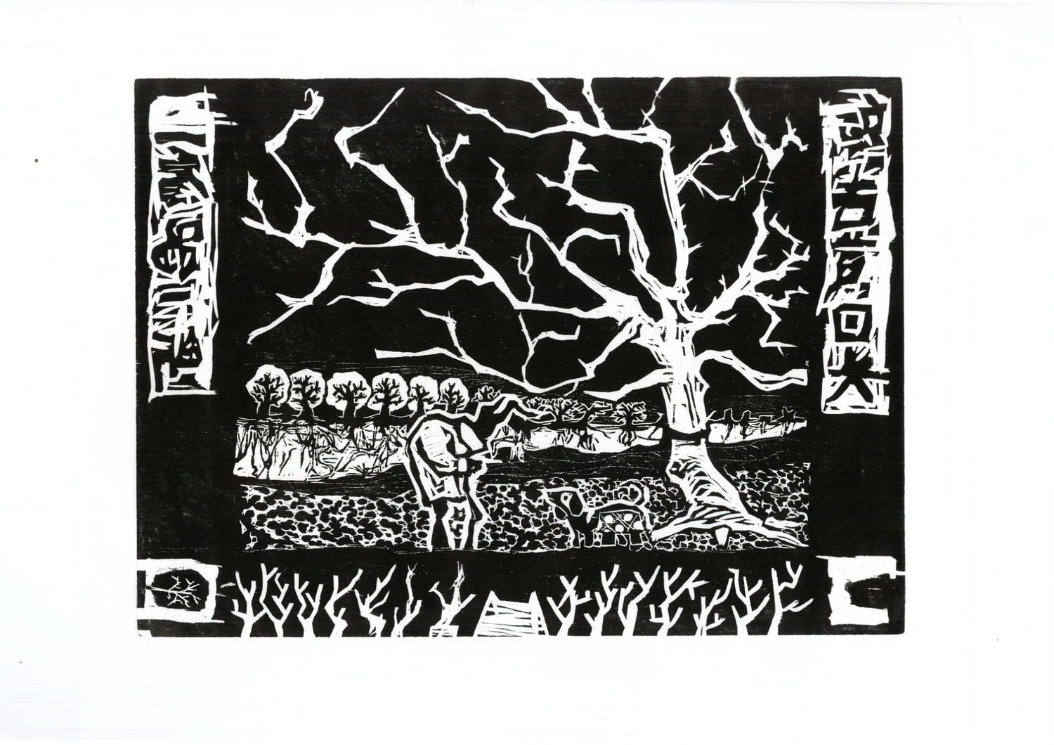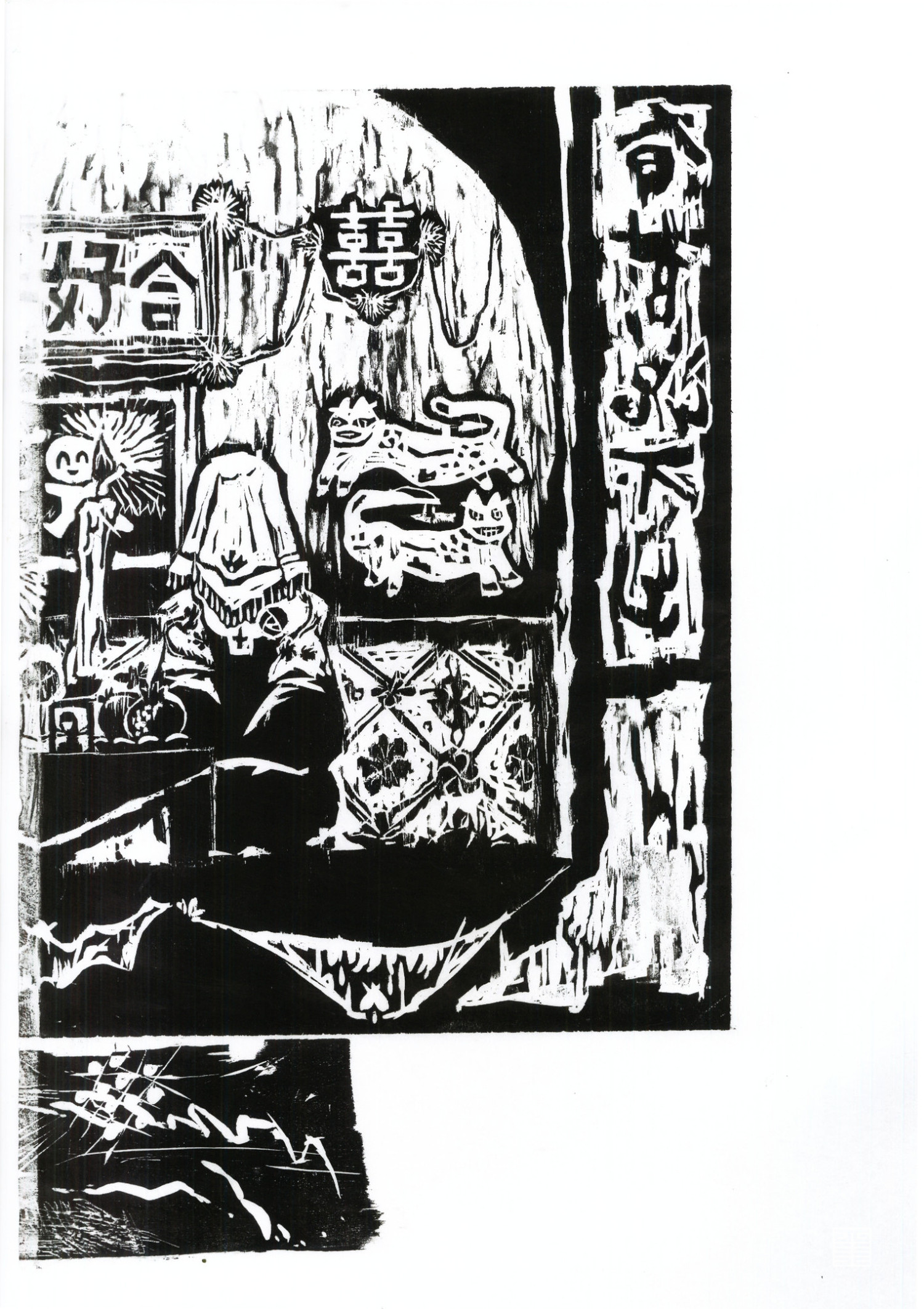 (因为只能10张,加上封面那版《戏:婚》太大了上传不成功,所以就放了印在2张纸上的《戏:婚》)这些版画算是我来到陕北枣林坪所见所闻后内心产生的胡思乱想。因为一些原因不好靠嘴巴说,于是我就把一些无厘头、不好解释的东东和这里随处可见的枣树、废旧戏台结合,变成正在表演的戏台。戏嘛就可以离谱可以没有逻辑,按我这个导演定好的剧本走。:D 所以看不懂很正常,我在这里也说不明白,说明白可能还没意思了。如果看完还觉得不理解,那简直太棒了 :D