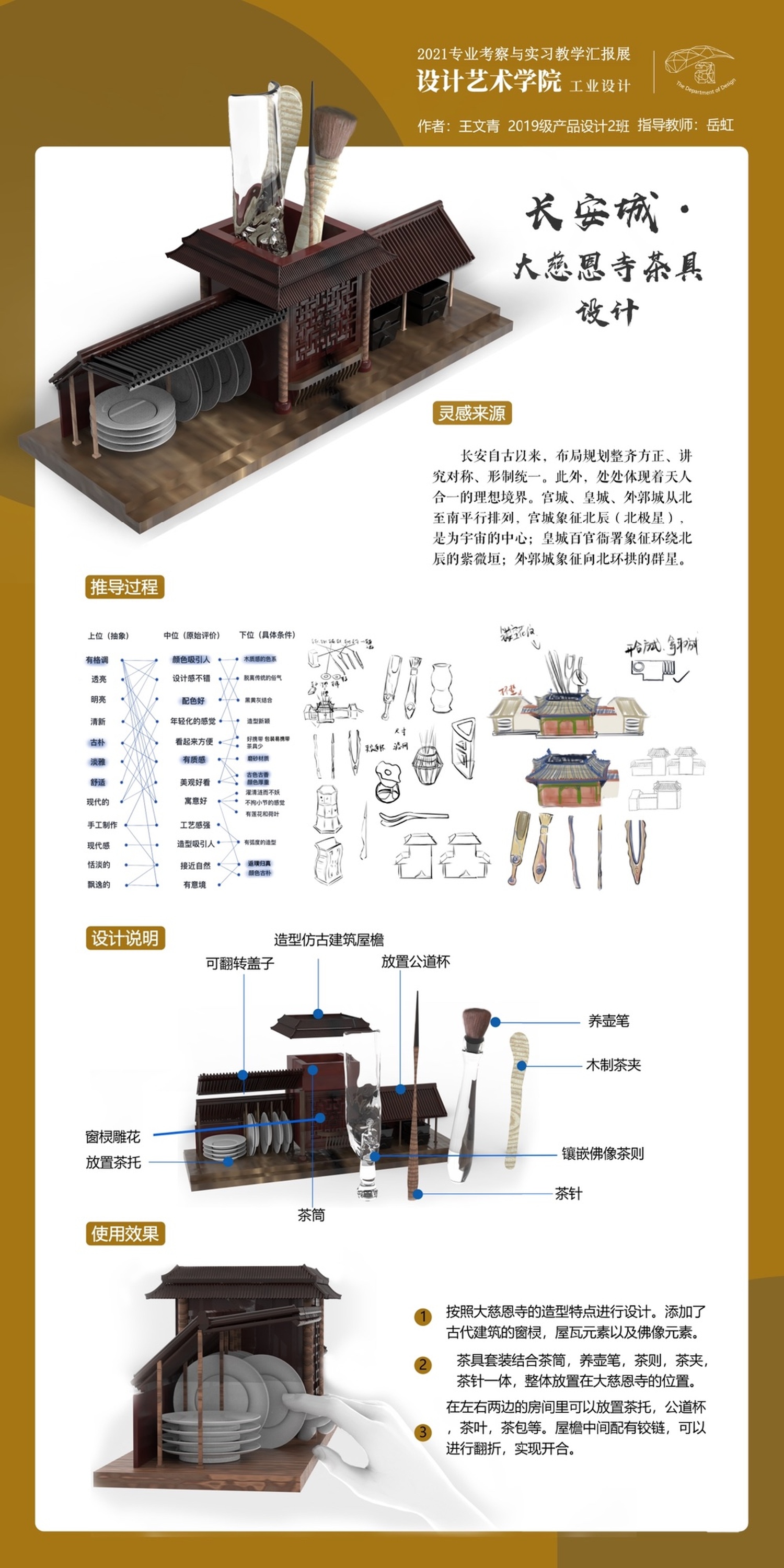 根据长安城的整齐方正形制统一的布局,体现天人合一的境界。根据大慈恩寺的造型特点进行重构,添加了古代建筑的窗棂元素以及佛像元素。茶具套装结合茶筒,养壶笔,茶则,茶夹,茶针一体,整体在茶盘中放置在大慈恩寺的位置。左右两边的房间可以放置茶托,公道杯,茶叶茶包等。屋檐中间配有铰链,可以进行翻折,实现开合的功能。