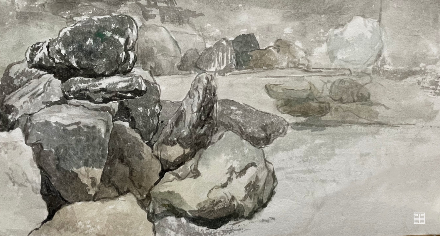 石头上的每一点粗糙错杂的纹理都象征生命的迹象,用水墨皴摖染,一点点探索自然本身。