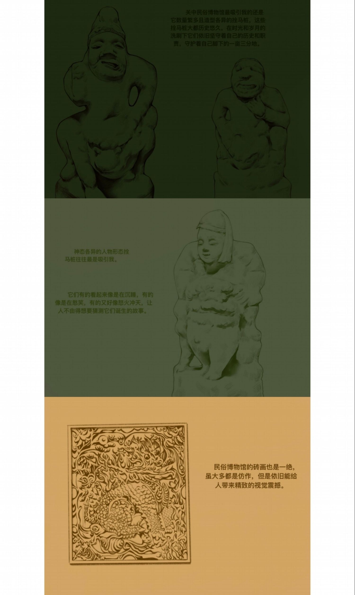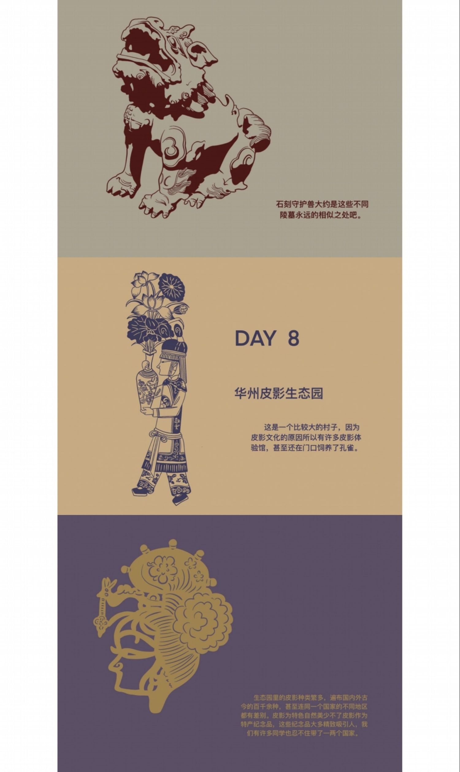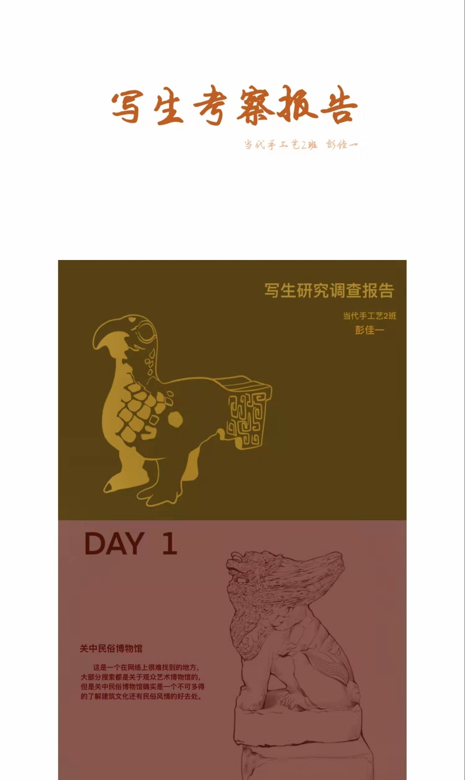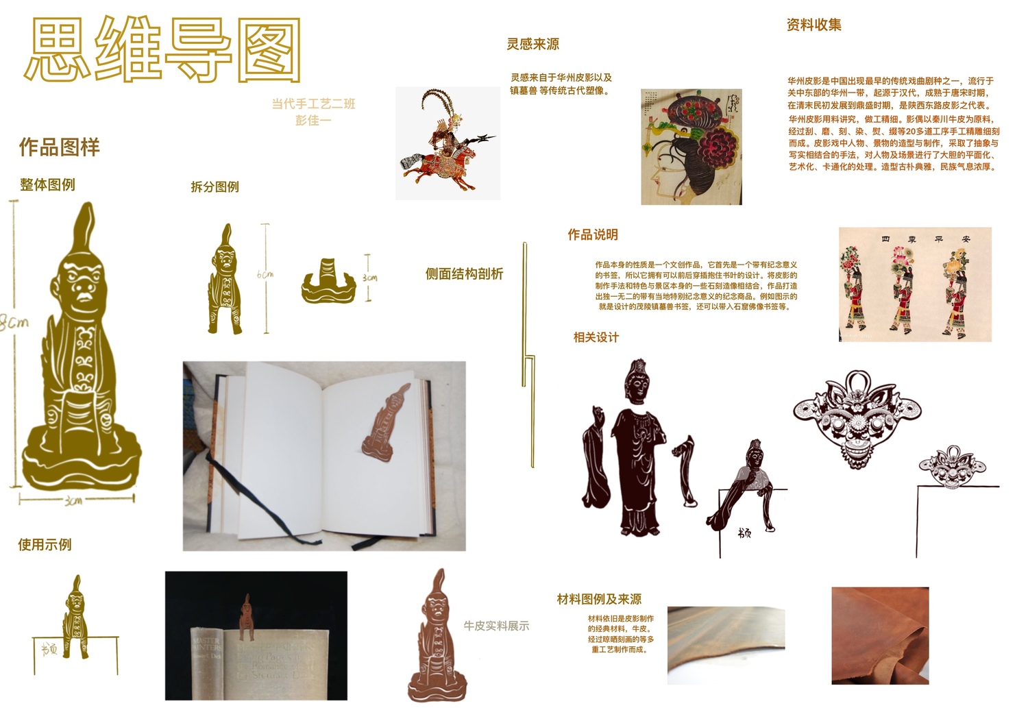 创作为《华州皮影文创》,旨在用皮影工艺展现当地文化结晶,让人们能将美好的记忆“带走”;考察报告为《陕西关中地区手工艺考察报告》,其中记录了这次外出考察的所见所闻还有一些个人感想;速写为《考察期间速写》着重记录了我每天看见的有意义的事物并为此留下纪念。