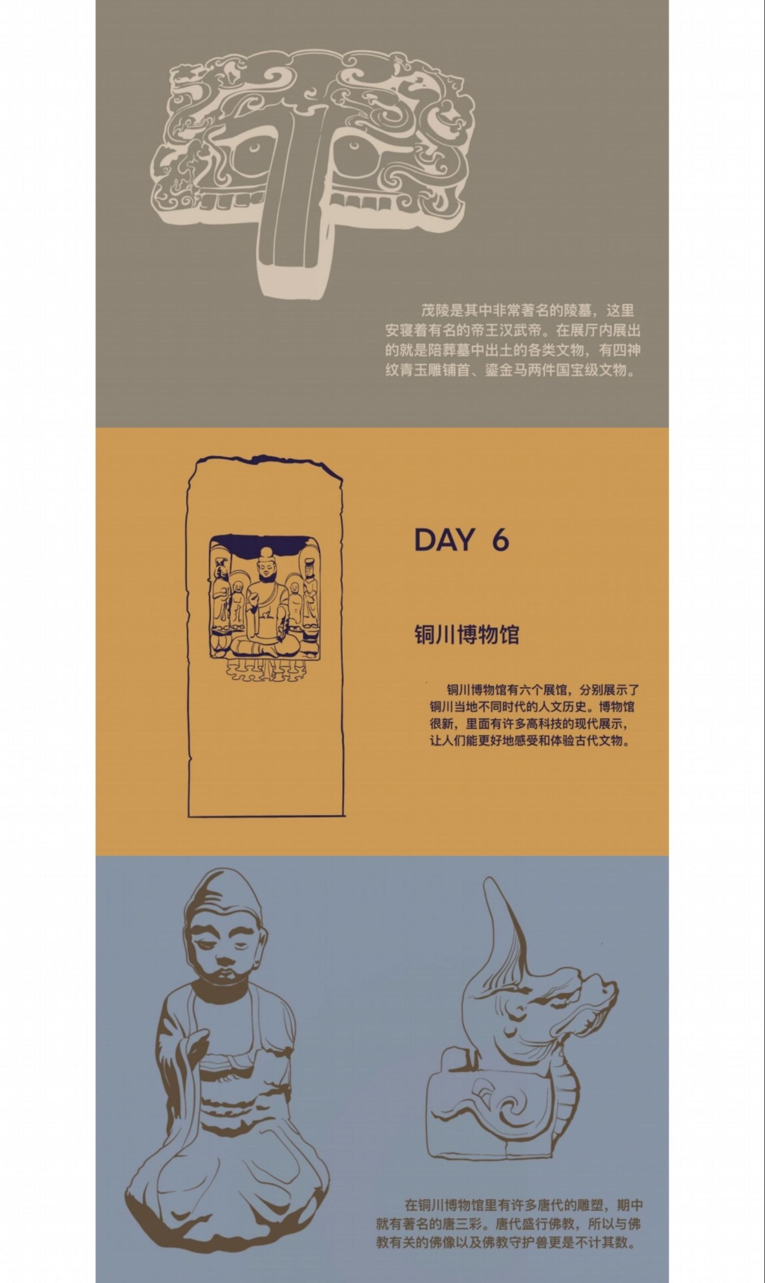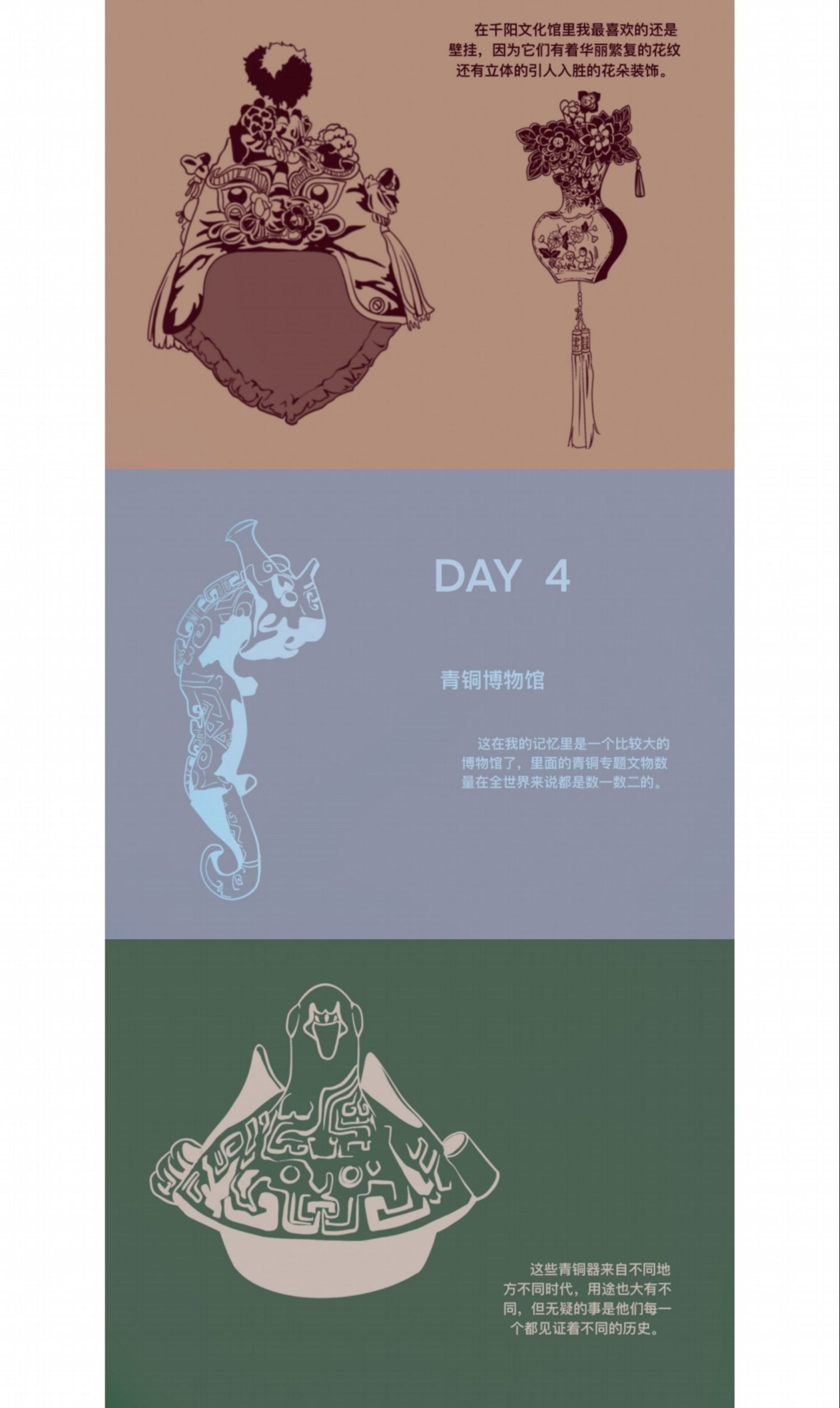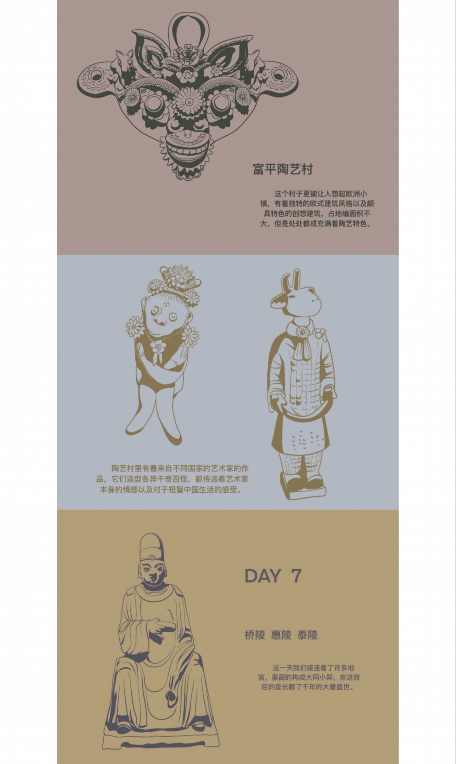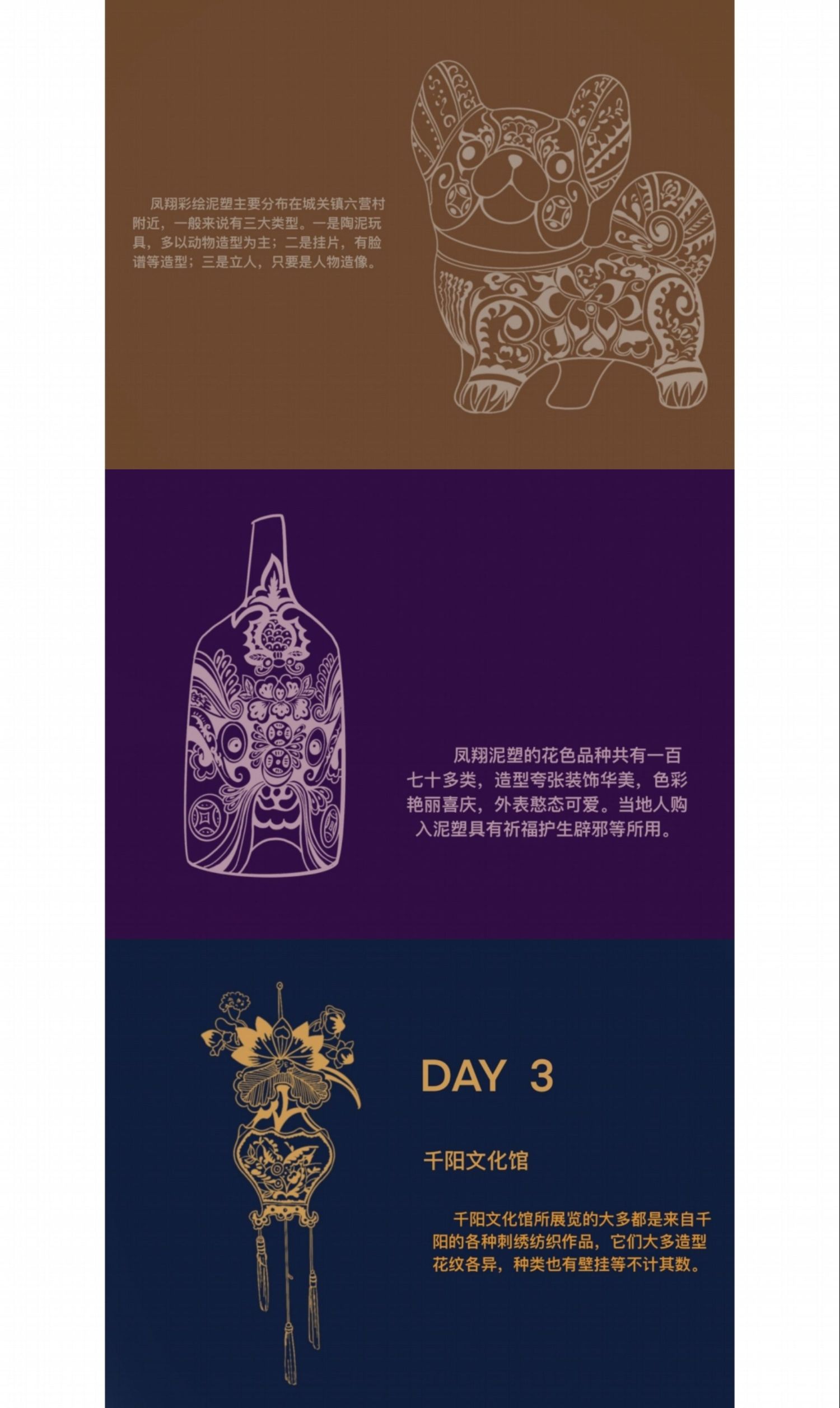 创作为《华州皮影文创》,旨在用皮影工艺展现当地文化结晶,让人们能将美好的记忆“带走”;考察报告为《陕西关中地区手工艺考察报告》,其中记录了这次外出考察的所见所闻还有一些个人感想;速写为《考察期间速写》着重记录了我每天看见的有意义的事物并为此留下纪念。