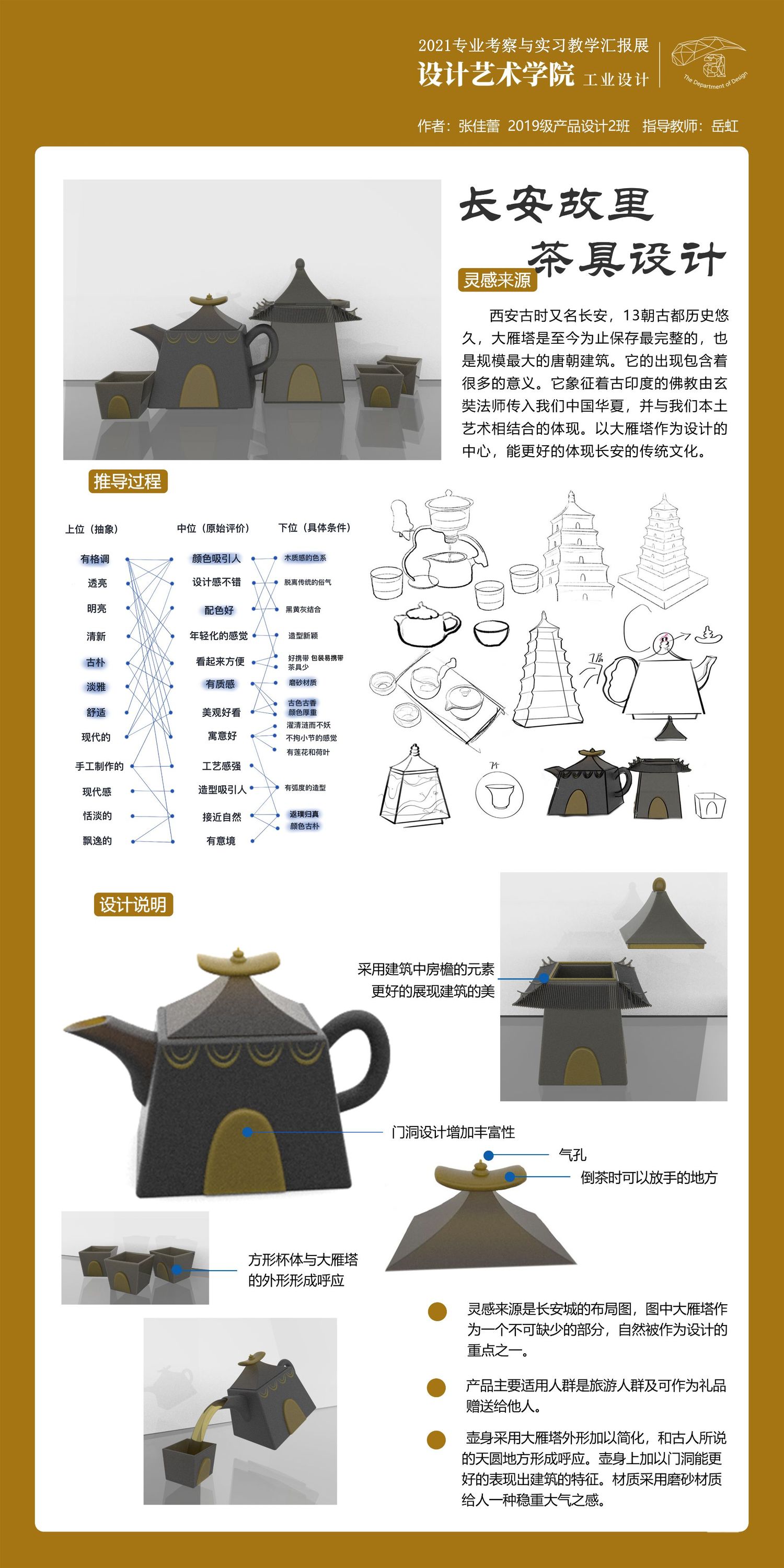 灵感来源是长安城的布局图,图中大雁塔作为一个不可缺少的部分,自然被作为设计的重点之一。产品主要适用人群是旅游人群及可作为礼品赠送给他人。壶身采用大雁塔外形加以简化,和古人所说的天圆地方形成呼应。壶身上加以门洞能更好的表现出建筑的特征。材质采用磨砂材质给人一种稳重大气之感。