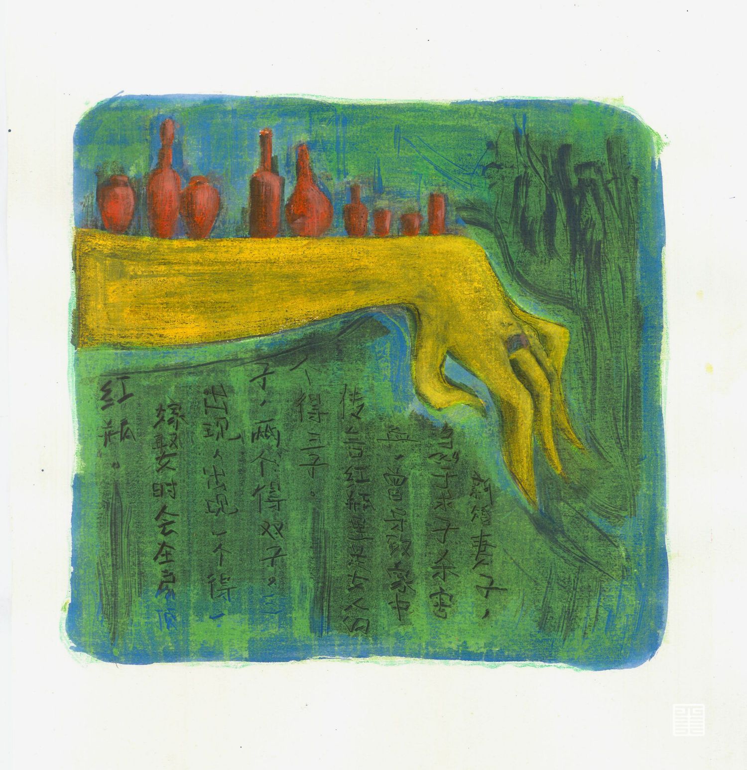 本作品运用了对印等版画手法经过将近一个月对陕北当地的文化考察,描绘了18个独特的当地民间物品,成稿三张。是我对当地民风民俗一个感受性的理解,融入了很多个人情感。每个物品都有画面和文字相结合,用图文并茂的形式来述说每一个物品的故事。