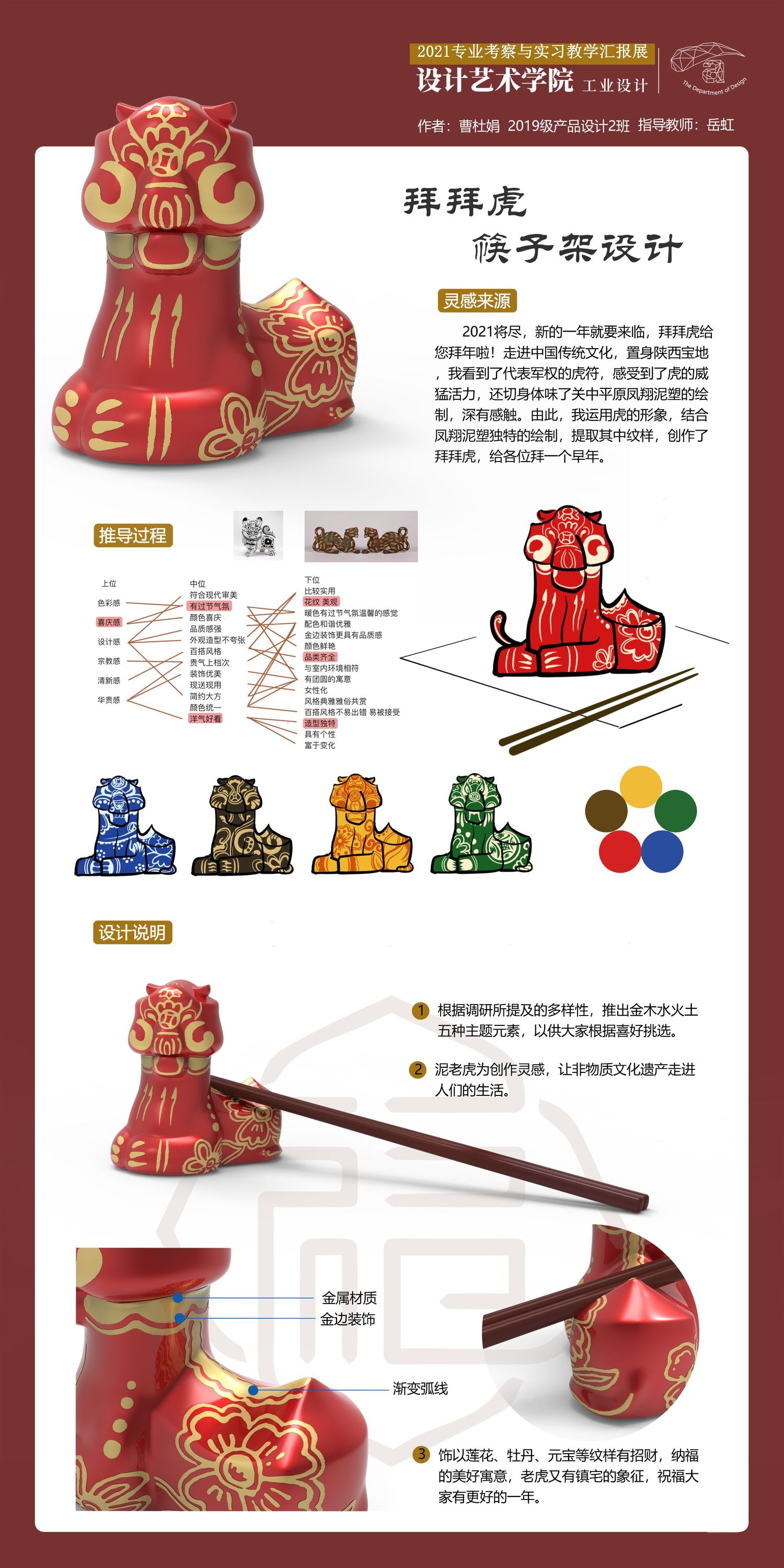 2021将尽,新的一年就要来临,拜拜虎给您拜年啦!走进中国传统文化,置身陕西宝地,我看到了代表军权的虎符,感受到了虎的威猛活力,还切身体味了关中平原凤翔泥塑的绘制,深有感触。由此,我运用虎的形象,结合凤翔泥塑独特的绘制,提取其中纹样,创作了拜拜虎,给各位拜一个早年。