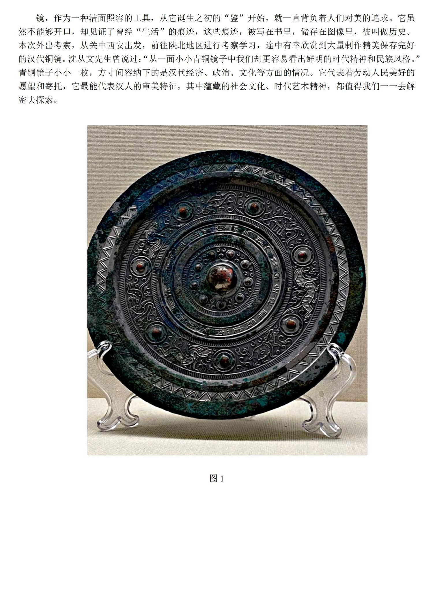 镜,作为一种洁面照容的工具,从它诞生之初的“鉴”开始,就一直背负着人们对美的追求。它虽然不能够开口,却见证了曾经“生活”的痕迹,这些痕迹,被写在书里,储存在图像里,被叫做历史。本次外出考察,从关中西安出发,前往陕北地区进行考察学习,途中有幸欣赏到大量制作精美保存完好的汉代铜镜。沈从文先生曾说过:“从一面小小青铜镜子中我们却更容易看出鲜明的时代精神和民族风格。”青铜镜子小小一枚,方寸间容纳下的是汉代经济、政治、文化等方面的情况。它代表着劳动人民美好的愿望和寄托,它最能代表汉人的审美特征,其中蕴藏的社会文化、时代艺术精神,都值得我们一一去解密去探索。