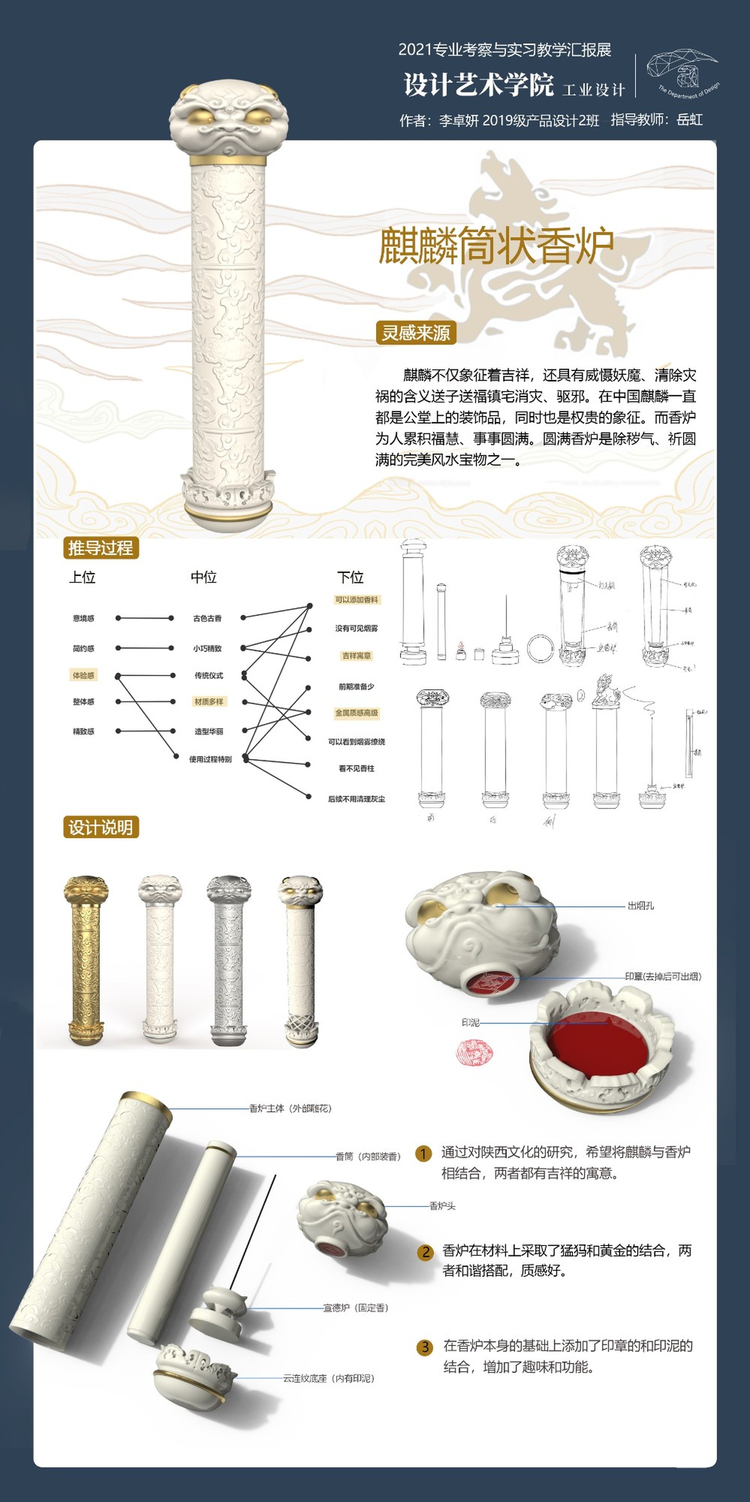 通过对陕西文化的研究,希望将麒麟与香炉相结合,两者都有吉祥的寓意。香炉在材料上采取了猛犸和黄金的结合,两者和谐搭配,质感好。在香炉本身的基础上添加了印章的和印泥的结合,增加了趣味和功能。