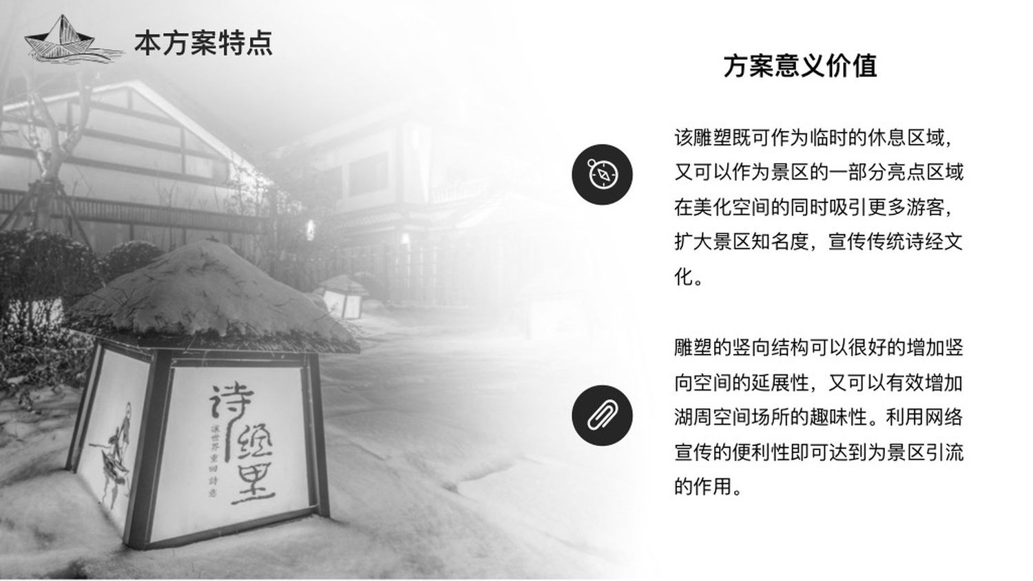 该雕塑既可作为临时的休息区域,又可以作为景区的一部分亮点区域,在美化空间的同时吸引更多游客,扩大景区知名度,宣传传统诗经文化。