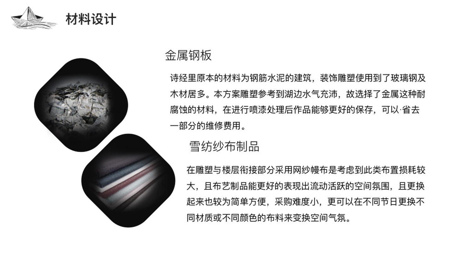 材料使用到金属是参考到湖边水气充沛,故选择了金属这种耐腐蚀的材料,在进行喷漆处理后作品能够更好的保存,省去一部分的维修费用。