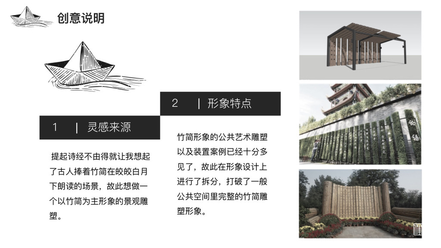 提起诗经不由得就让我想起了古人捧着竹简在皎皎白月下朗读的场景,故此想做一个以竹简为主形象的景观雕塑。