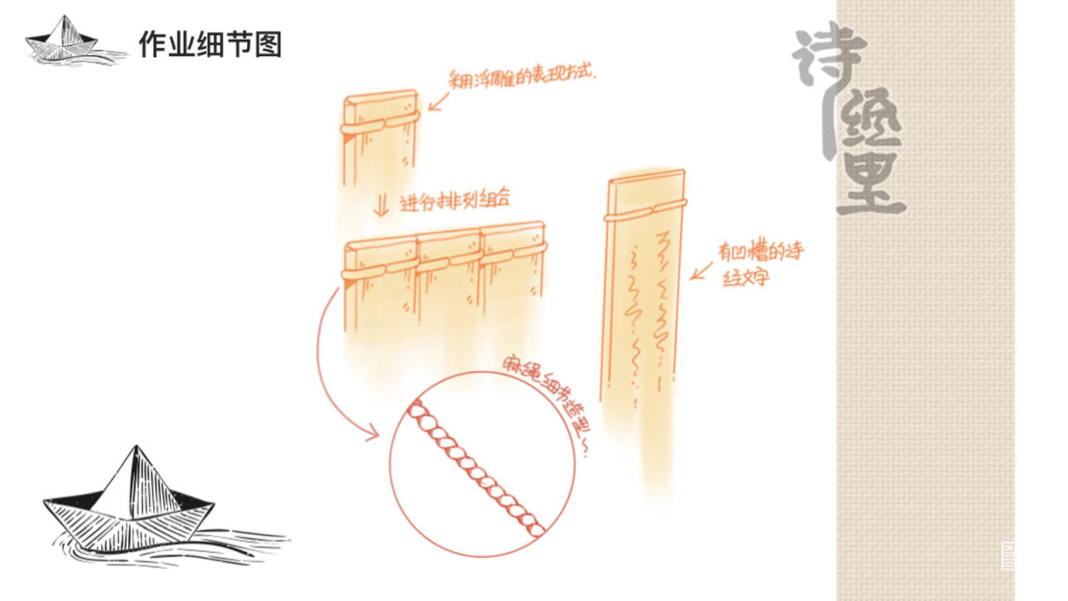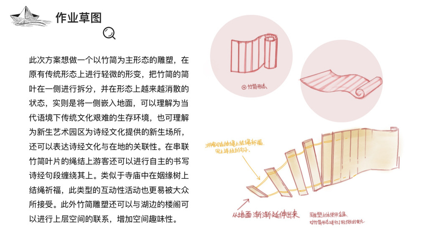 此次方案想做一个以竹简为主形态的雕塑,在原有传统形态上进行轻微的形变,把竹简的简叶在一侧进行拆分,并在形态上越来越消散的状态,实则是将一侧嵌入地面。表达诗经文化与在地的关联性。在串联竹简叶片的绳结上游客还可以进行自主的书写诗经句段来缠绕在其上。类似于寺庙中在姻缘树上结绳祈福的状态。竹简雕塑与湖边的楼阁可以进行上层空间的联系。