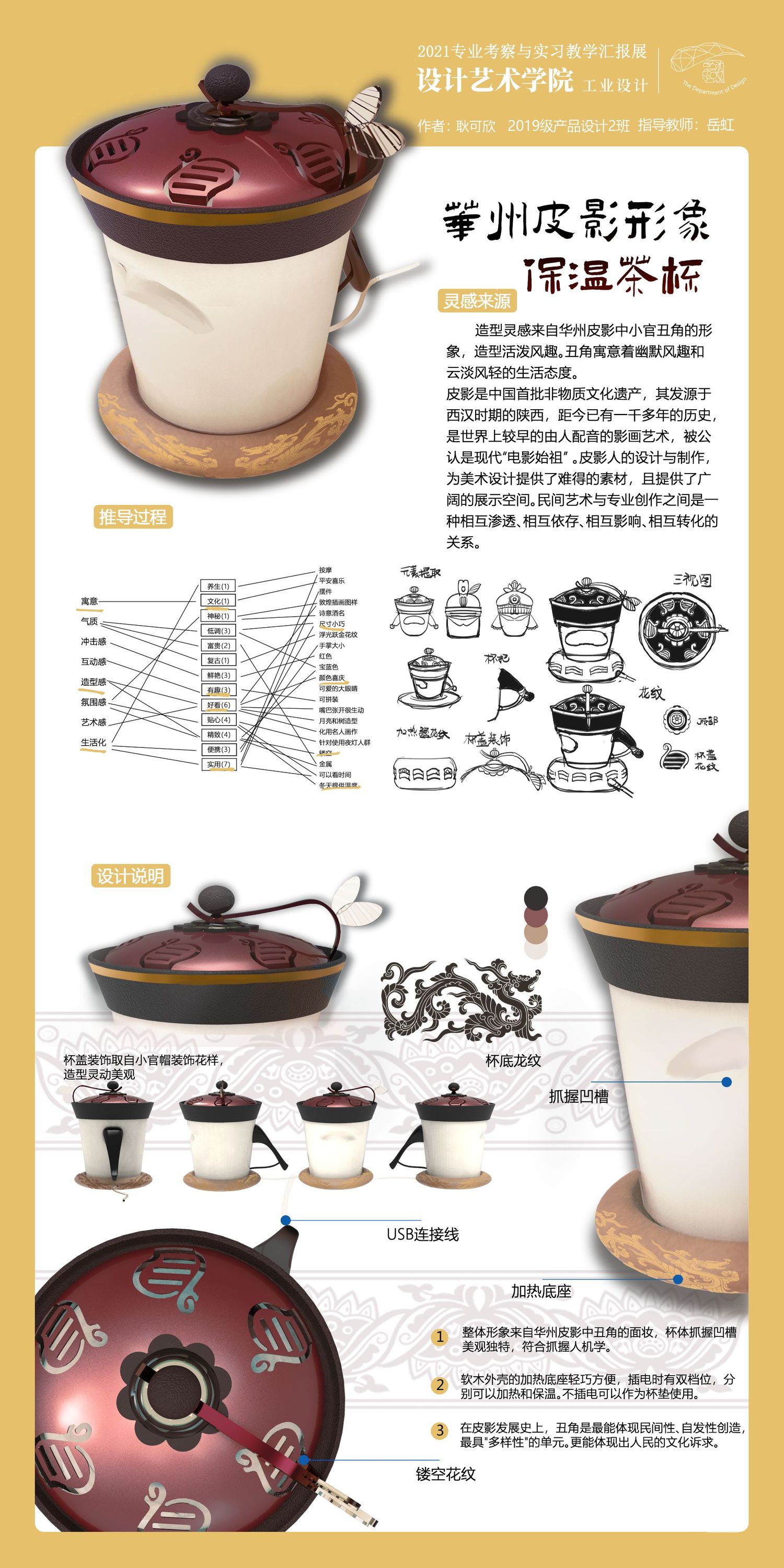 本产品是一款茶杯。整体形象来自华州皮影中丑角的面妆,杯体抓握凹槽美观独特,符合抓握人机学。软木外壳的加热底座轻巧方便,插电时有双档位,分别可以加热和保温。不插电可以作为杯垫使用。在文化含义上,皮影发展史中丑角是最能体现民间性、自发性创造,最具"多样性"的单元。更能体现出人民的文化诉求。