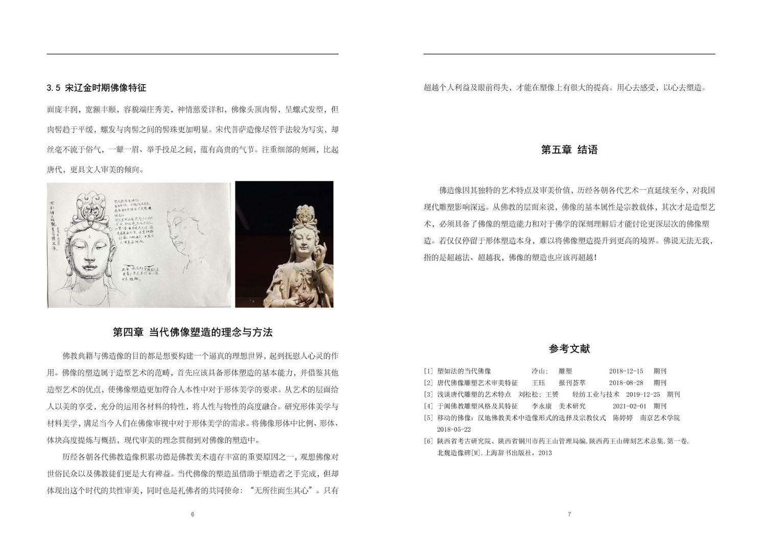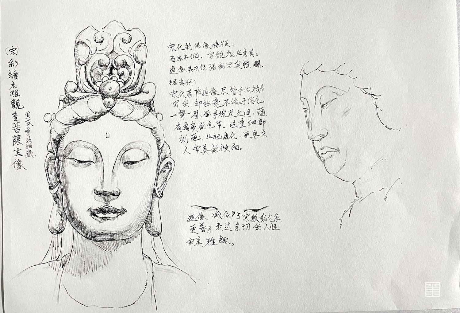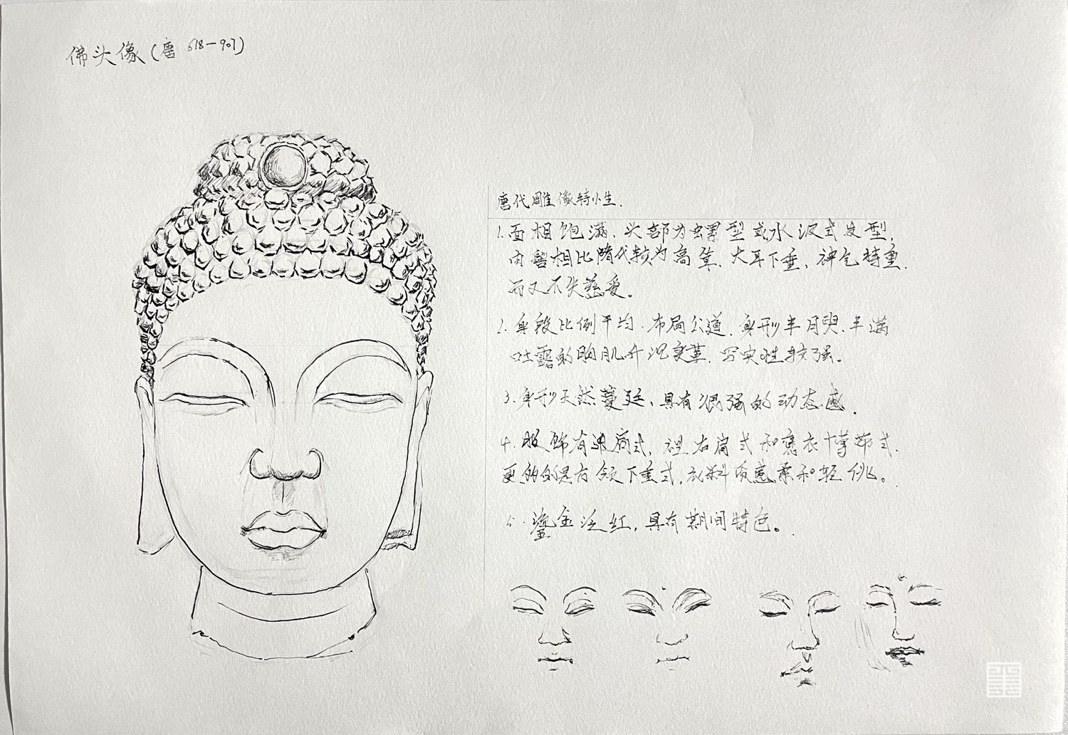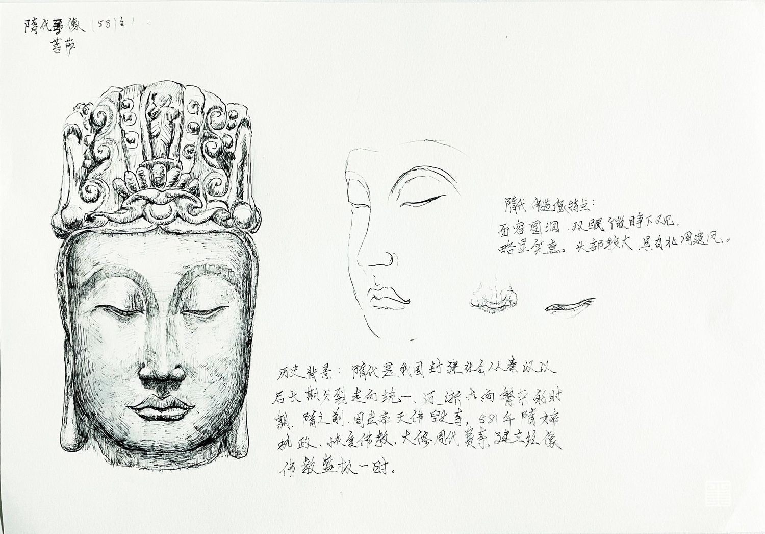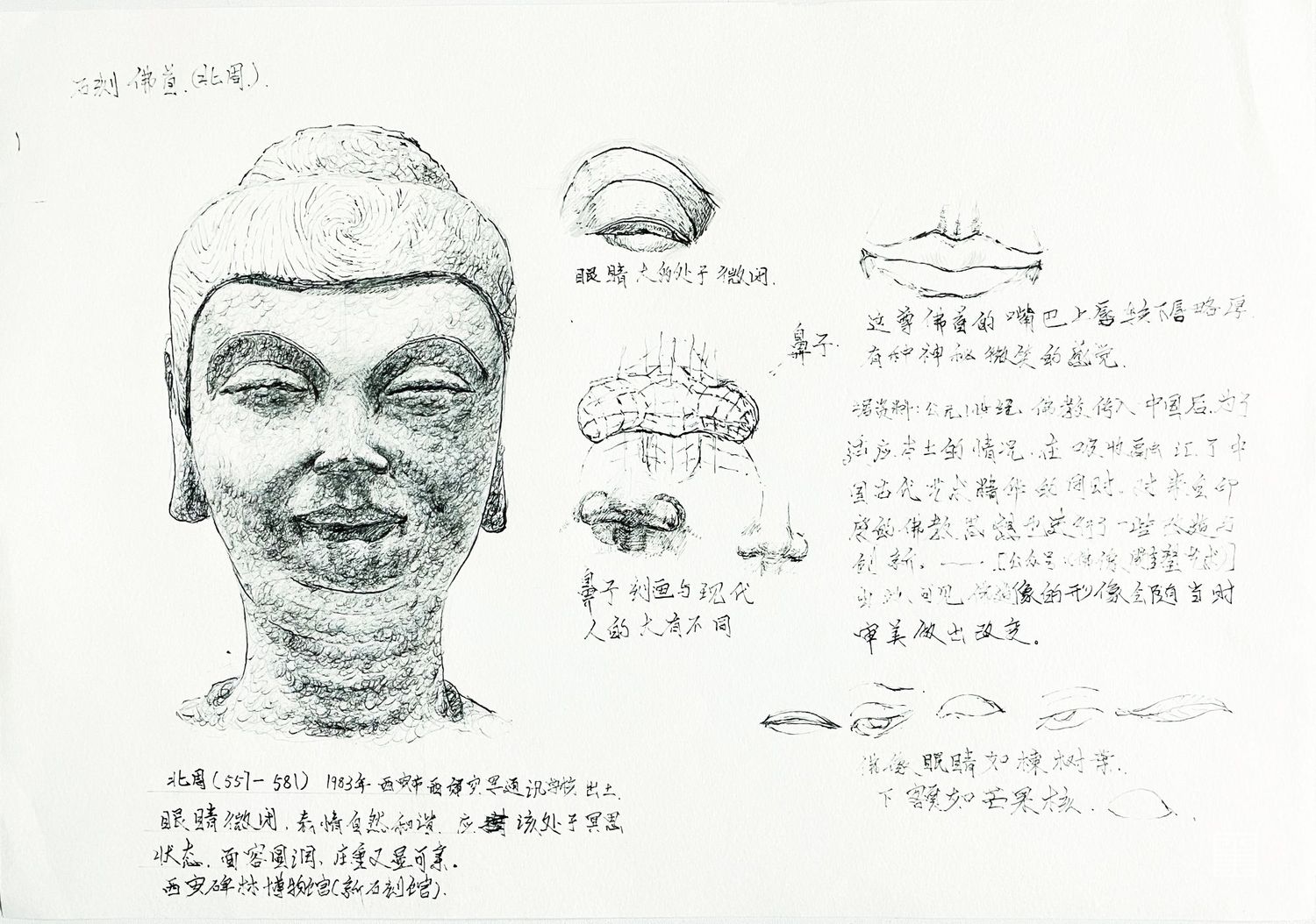 自西汉末年,佛教传入中国,此后随各个时代以及不同地域的文化习俗而演变。佛教造像是为宣传佛教思想服务,造像形式的选择在不同程度上反映了佛教本土化的演变过程,也体现了信徒的行为和信仰模式。不同的造像形式对宗教仪式在地点、规模、参拜方式等方面有影响,宗教仪式也显示出对佛教造像形式的限制和约束。在中国古代雕塑史中,雕塑大都是由民间艺人雕凿的,通常反映了当时社会人民大众的审美标准,反映了所在时代的政治大背景。这次写生速写及论文,我研究不同朝代佛像五官的塑,造结合当时时代背景感触极深。