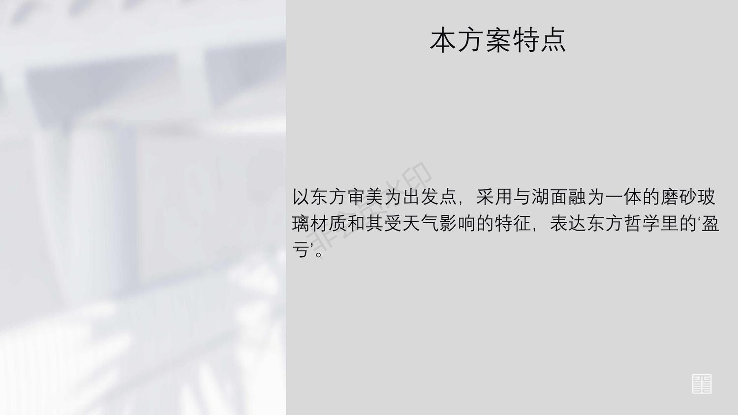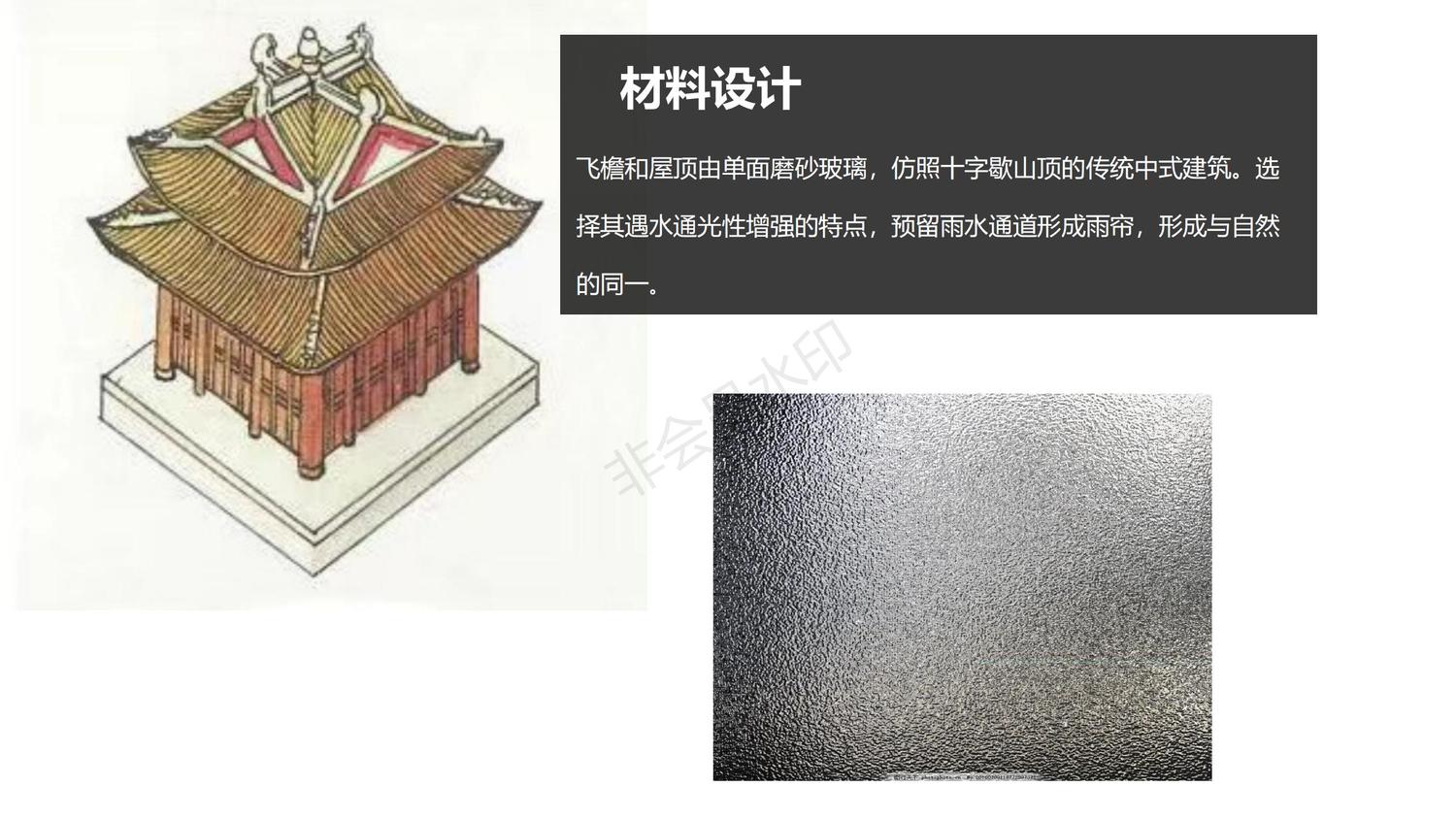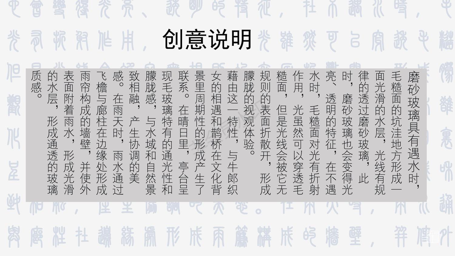 藉由这一特性,与牛郎织女的相遇和鹊桥在文化背景里周期性的形成产生了联系。在晴日里,亭台呈现毛玻璃特有的通光性和朦胧感,与水域和自然景致相融,产生协调的美感。在雨天时,雨水通过飞檐与廊柱在边缘处形成雨帘构成的墙壁,并使外表面附着雨水,形成光滑的水层,形成通透的玻璃质感。