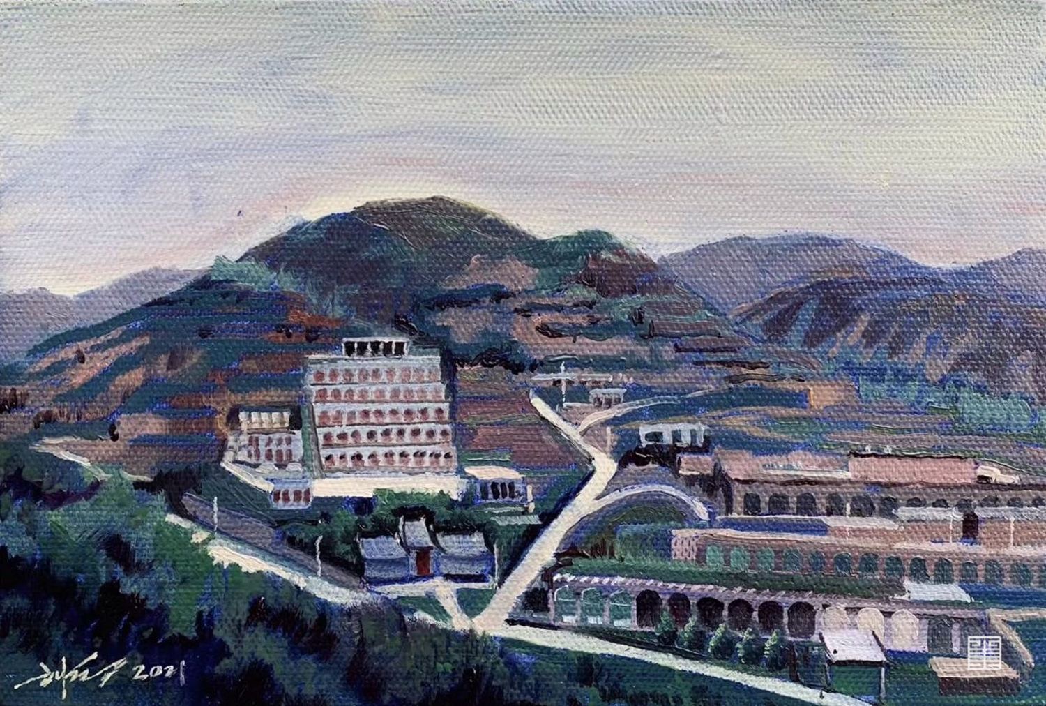 山村道路对面山腰上的一座木亭,是观赏贺家庄村的绝佳去处。窑洞和山坡交织出的景观,是人工与自然和谐而存的最好写照。