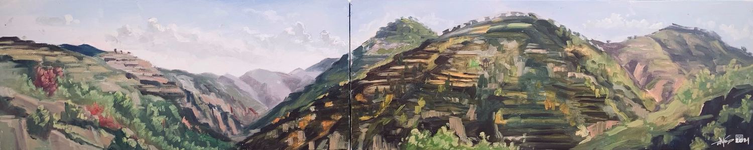 个人喜欢远景写生,而这种偏向全景的尺幅则是一种生动的体现。通过详尽的客观考察,在面对画面中的每一处风景的时候都会有所感触,进而有了进一步的主观处理,希望这种画面能够有一种纪实性的意味。 既客观地展现了山村之美,又主观地做出了个人取舍,有着一种纪实般的画面感。