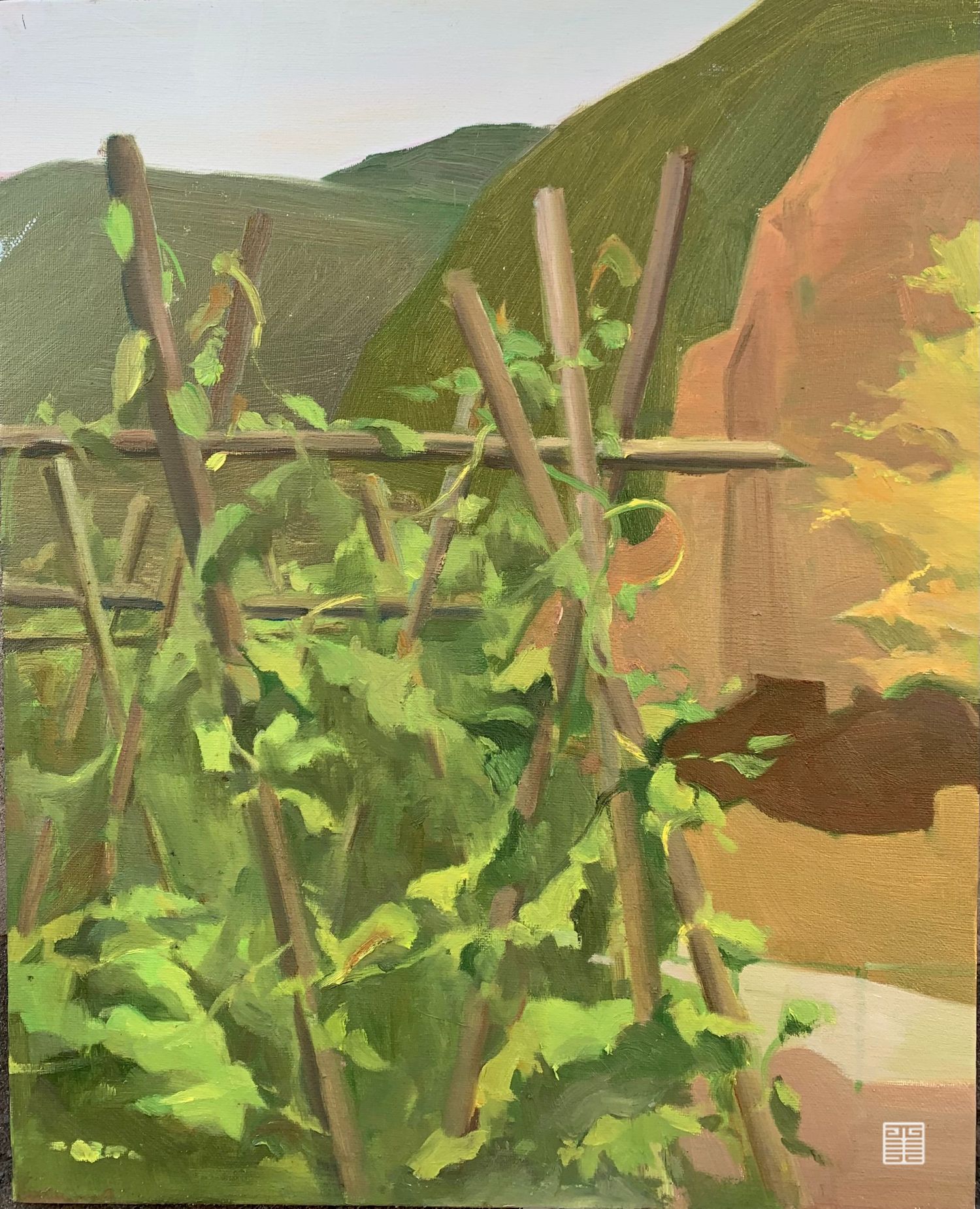 那张构图上用那几根支撑的竹架把画面给打破,远处的山很近处的土坡我都是简化处理,把整个画面的节奏给到最主要的竹架,竹架我修改了很多次,可能就像之前说的今天这里改改明天那里改改,不管是构图还是颜色都是很满意的一张作品