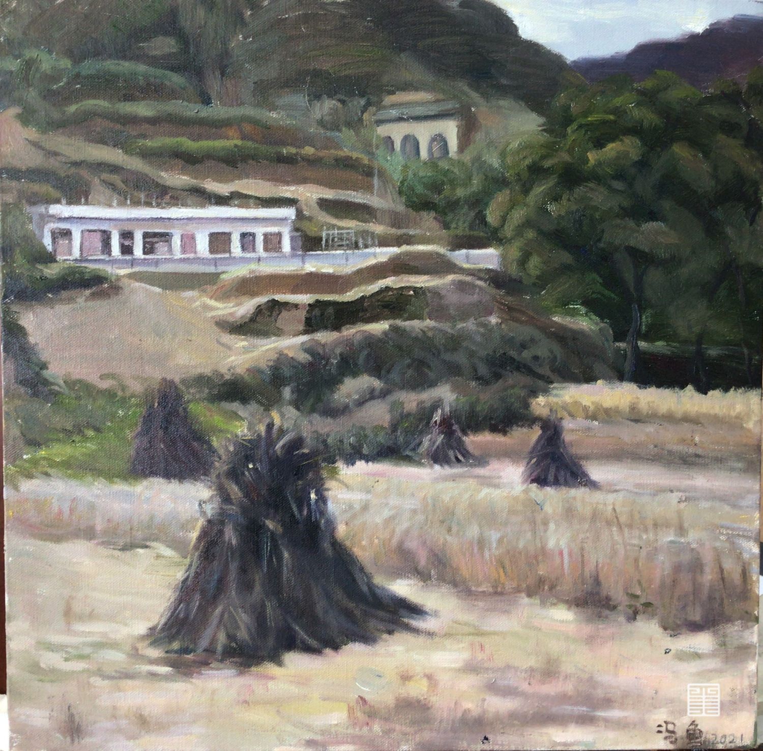在陕北绥德县贺家庄村,我用了三个多云的下午花了这副风景画,每到下午四五点的时候,就有三只鸡在庄稼地里散步觅食。