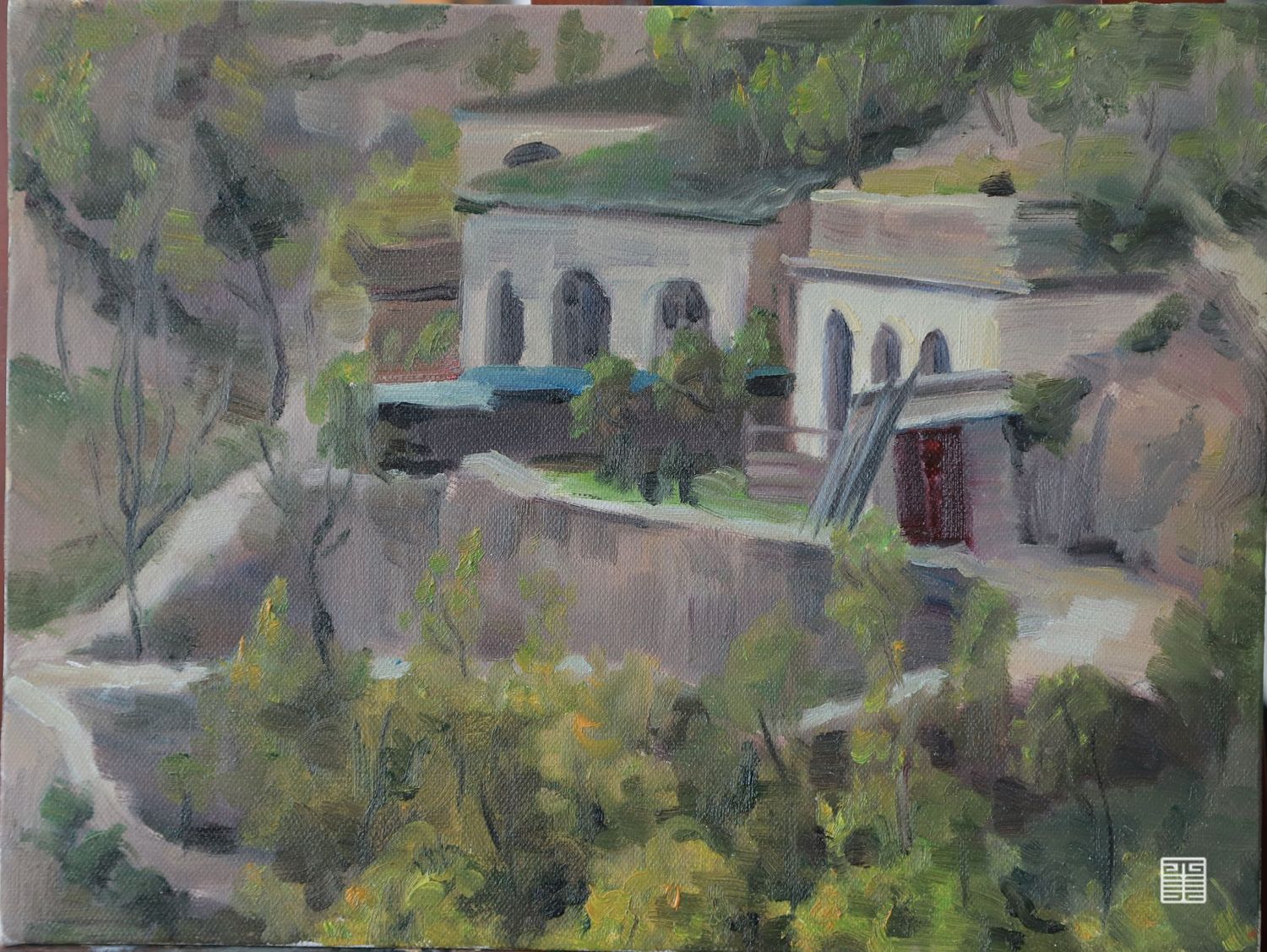 在陕北的第二幅风景写生,在对面山的深处,有几户人家镶嵌在山腰,有几条小路蜿蜒曲折,周围围满了树。