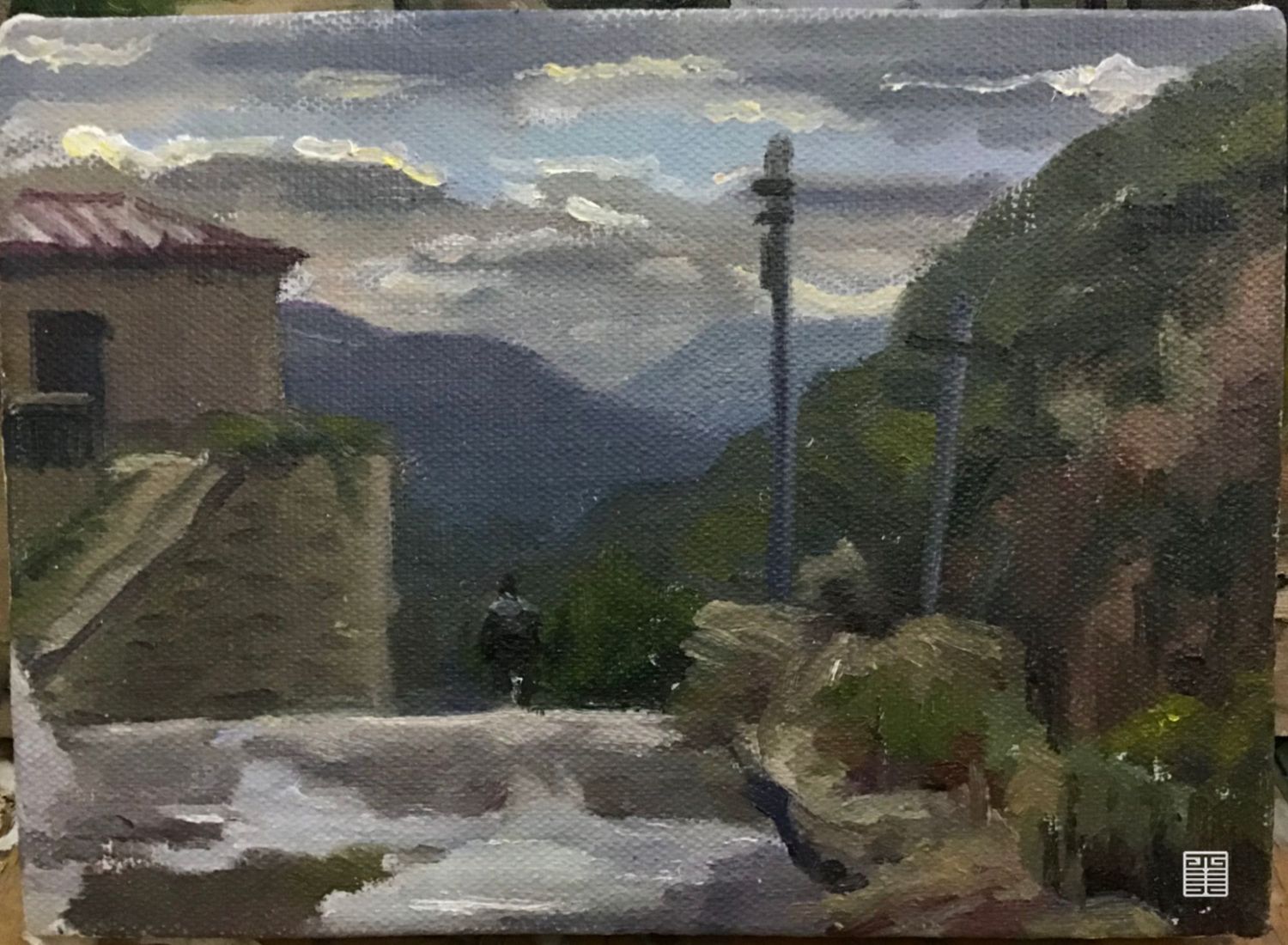 雨后清晨,在马路边上画画,用时两个小时画完这小幅风景画。