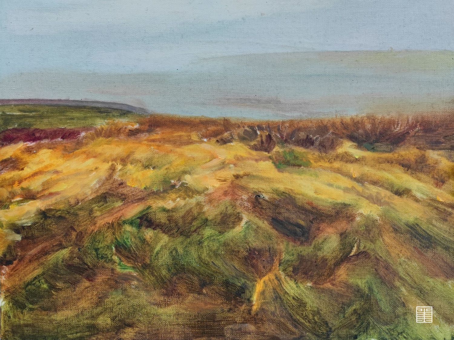 是一摊野草,坐落在崖上的。早晨的雾卷到滩上,干草也好像水底样的。但却任是枯黄的,干的河样罢。