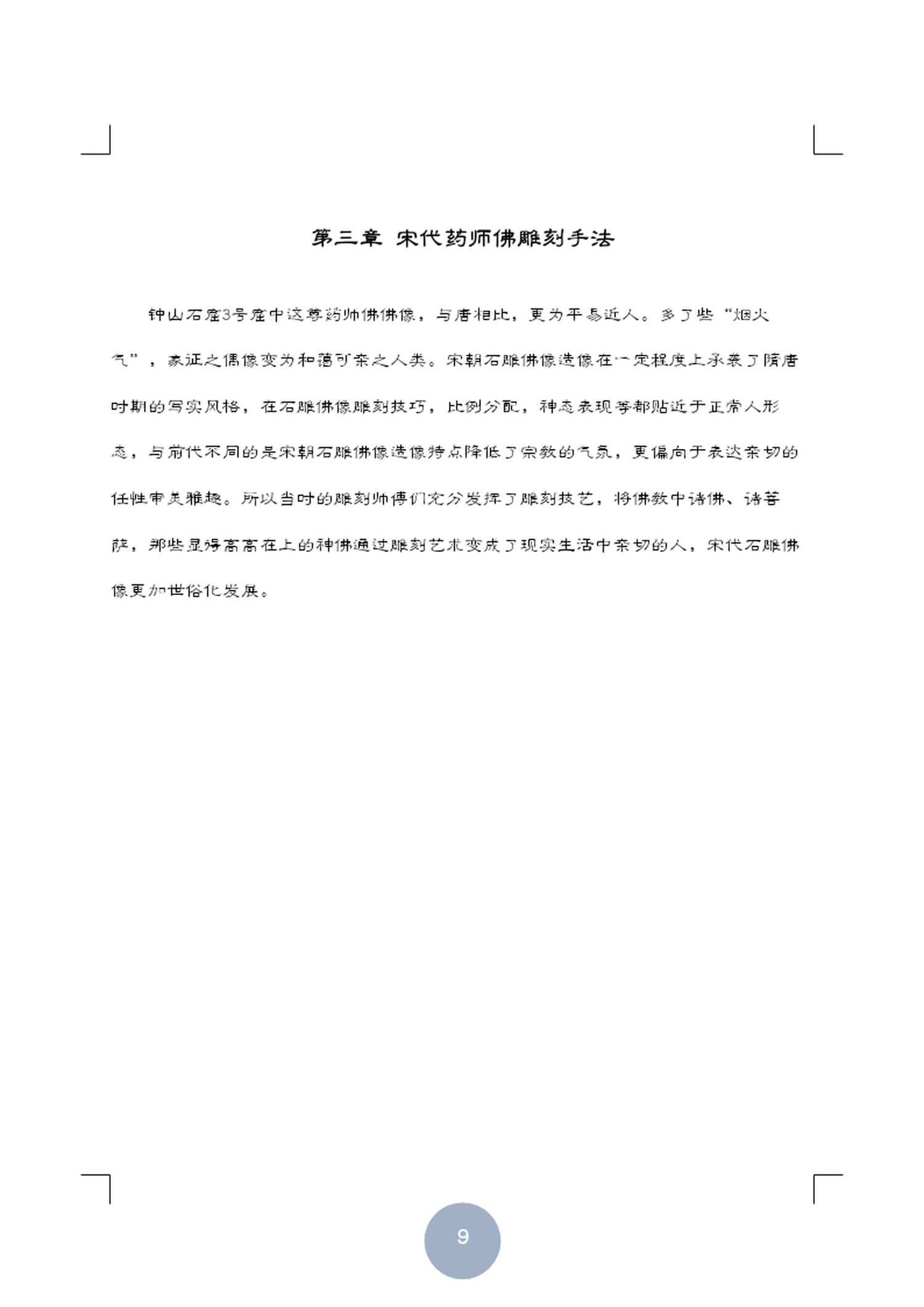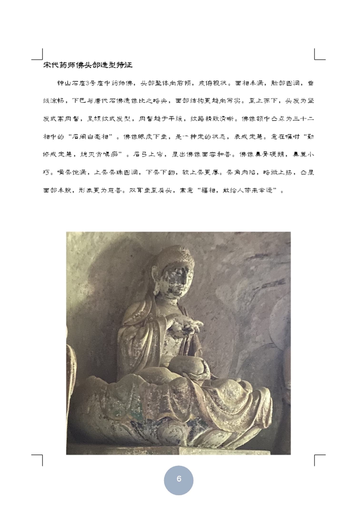 宋代药师佛造像基本继承唐代佛像特征,面庞丰润,宽额丰颐,容貌端庄秀美,神情慈爱详和,佛像头顶肉髻,呈螺式发型,但肉髻趋于平缓,螺发与肉髻之间的髻珠更加明显。身材匀称,服饰的衣褶流畅,凹凸有致。