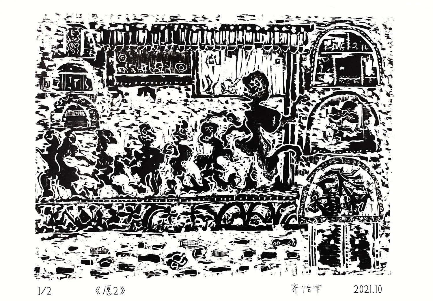 这组作品创作于绥德县枣林坪镇,讲述的是一位老爷爷从出生到他成家立业二十年来,与枣林坪这个地方一起经历的故事。我通过与爷爷的交流记录下他的话语,再用版画形式语言表现出来。听爷爷讲述的老槐神树、儿时吃食、绥德绘画比赛还有学习擒拿格斗,这些故事深深吸引着我……