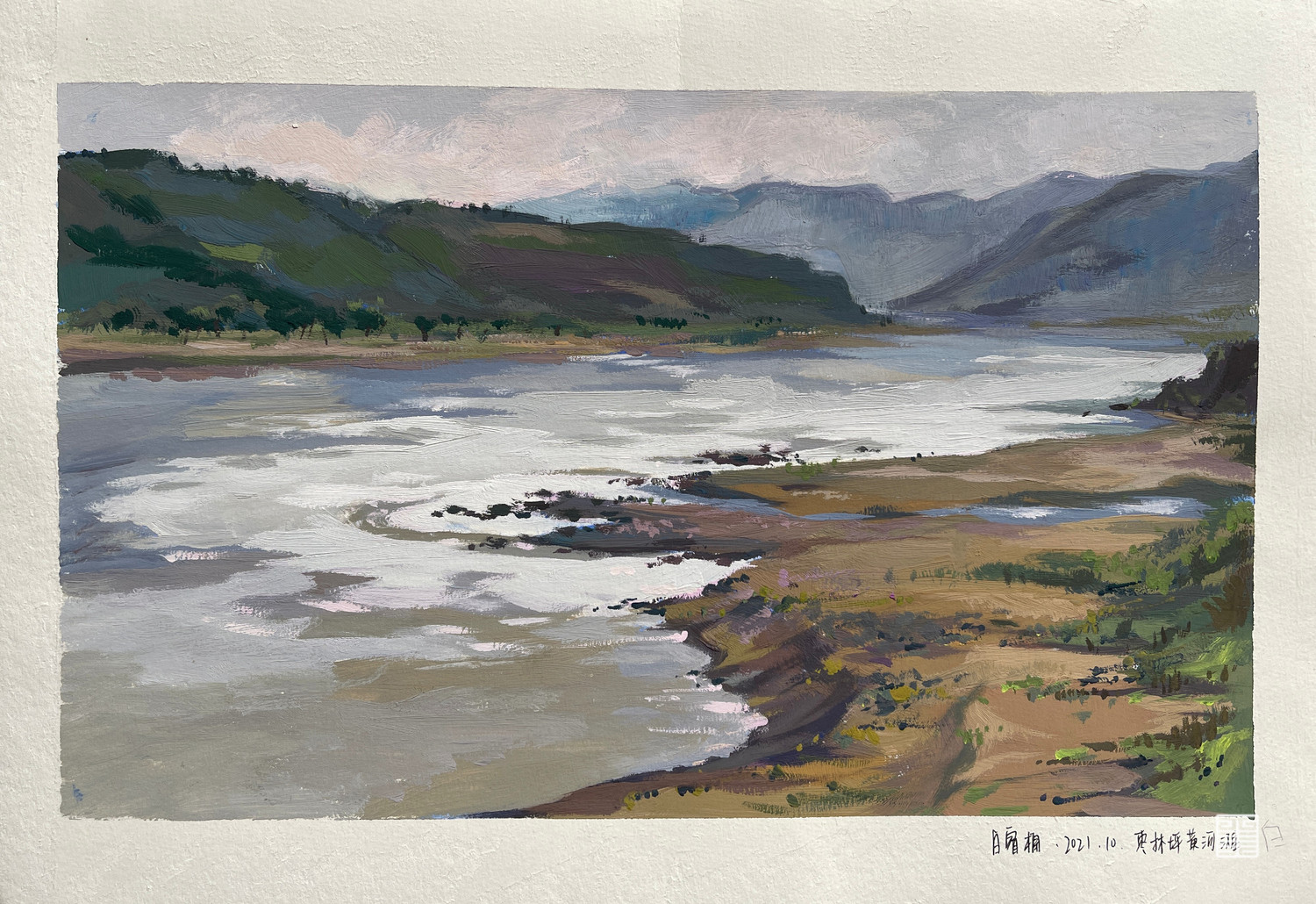 坐在马路边人家的小观景台上画的画,对于他们这是熟识的风景,对于我们则是发自内心的感慨和震撼,晨雾未散,浩浩汤汤,母亲河一隔秦晋。