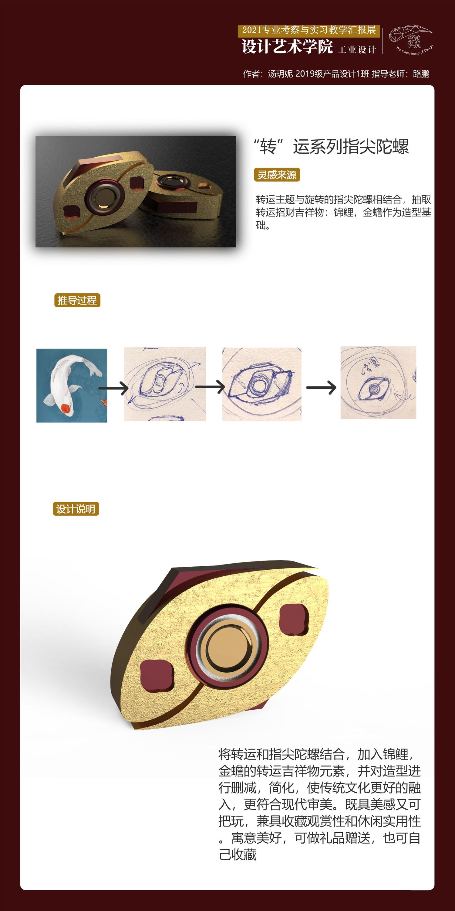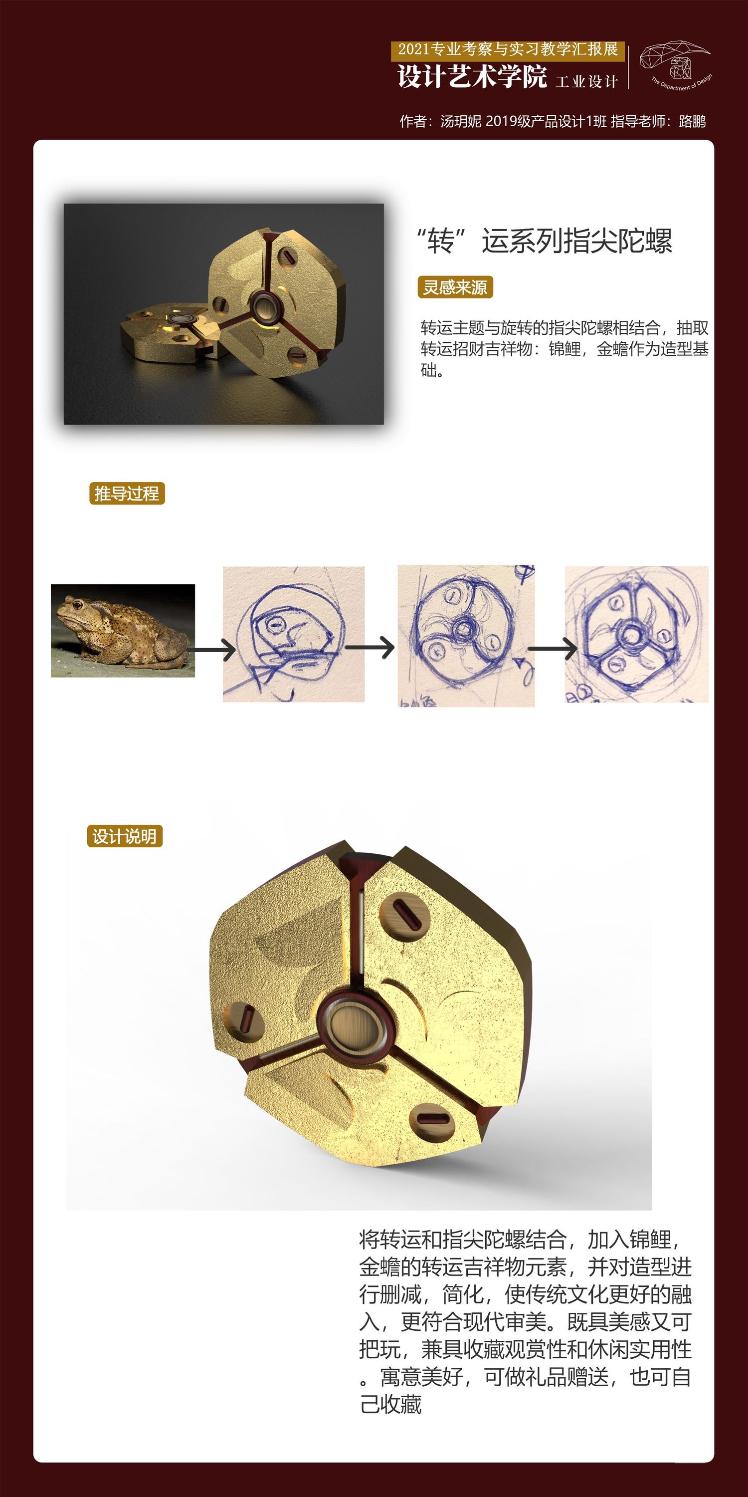 将转运和指尖陀螺结合,加入锦鲤,金蟾的转运吉祥物元素,并对造型进行删减,简化,使传统文化更好的融入,更符合现代审美。既具美感又可把玩,兼具收藏观赏性和休闲实用性。寓意美好,可做礼品赠送,也可自己收藏