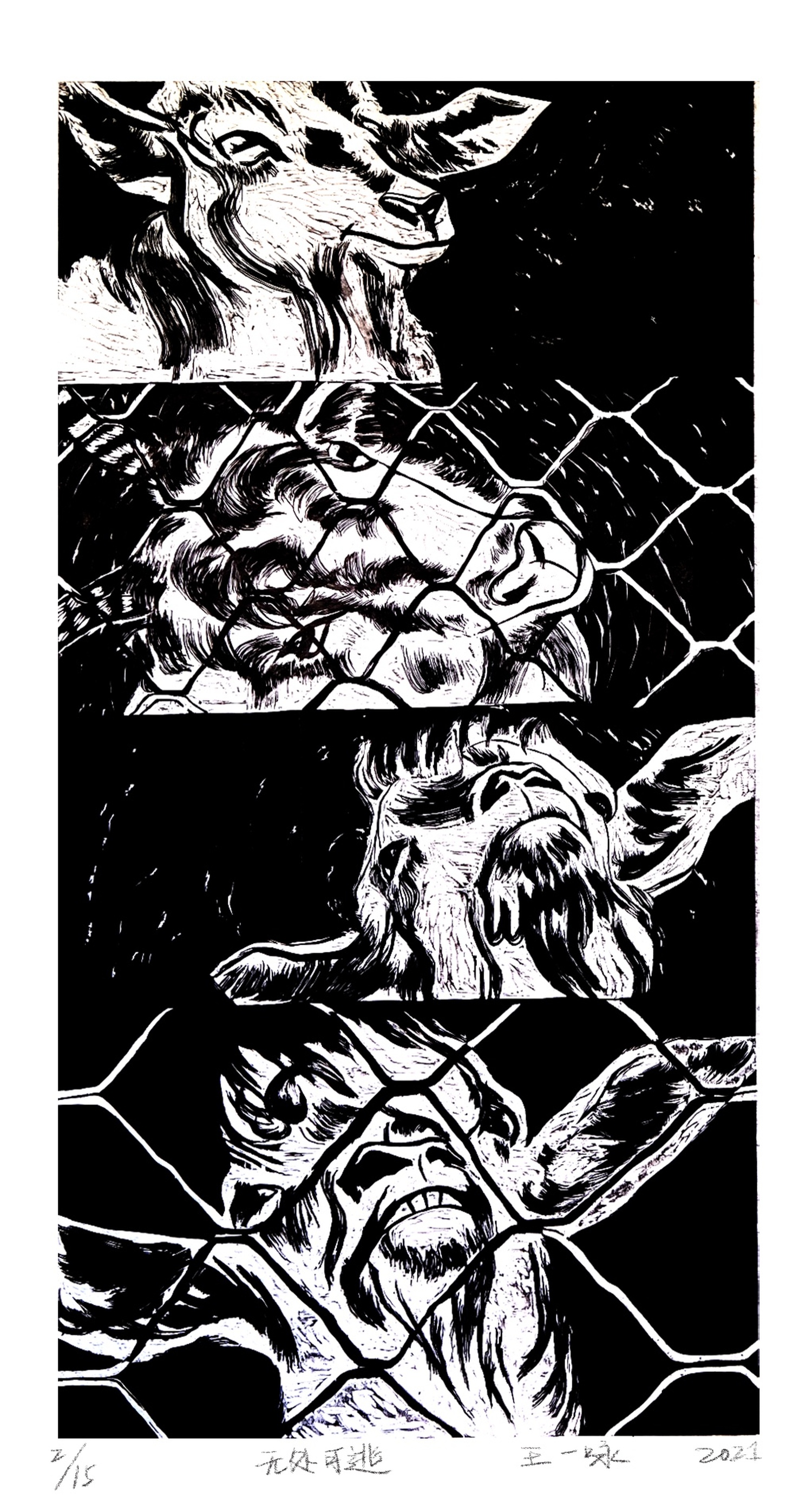 《无处可逃》通过一只羊从平静祥和、努力挣扎到绝望再到愤怒不甘的神情状态变化表现了他身在禁锢之中而不自知,到试图自由却发现难以挣脱,在努力挣扎后的疲累与绝望,再到最后他已经清醒的知道自己身在禁锢中却难以改变周身环境的愤怒与不甘。人又何尝不是这样?我通过这样画面变化的表现形式试图表达出一点点关于此情的荒诞可笑和无奈,画面并没有标准答案,如果观众有其他感受也未尝不可,一切以自身感受为准。