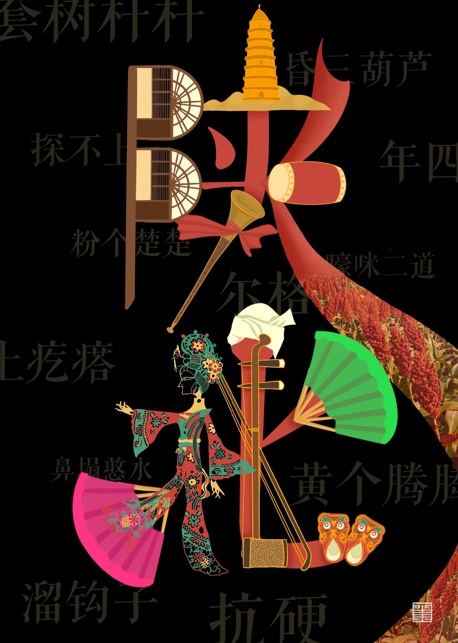 作品1: 本作品是由陕北元素组成的“陕北”两字,包含陕北窑洞,延安白塔山,安塞腰鼓,绥德唢呐,米脂秧歌扇子,皮影,二胡,陕北头巾,虎头鞋,红高粱等,背景由陕北方言组成。