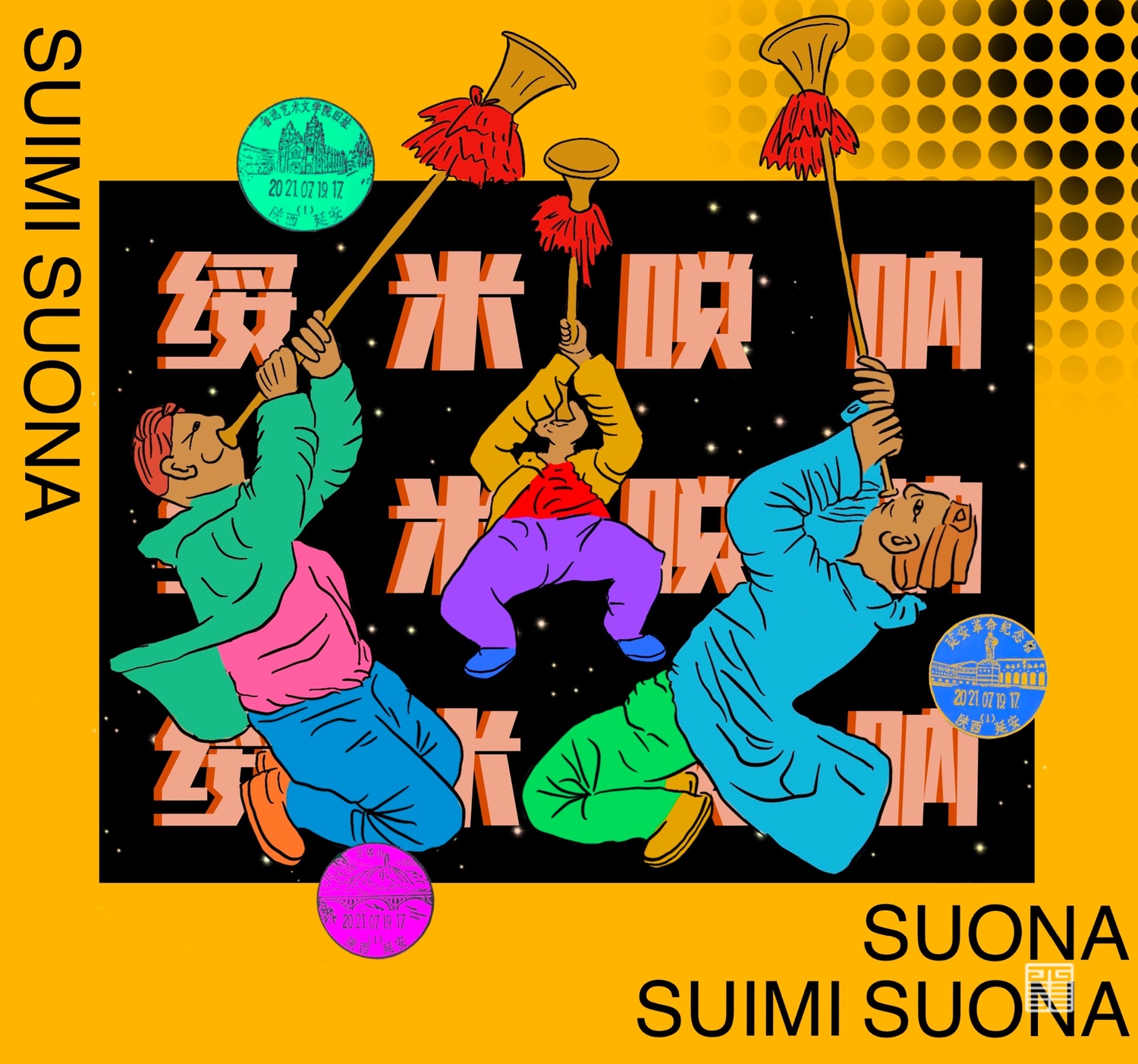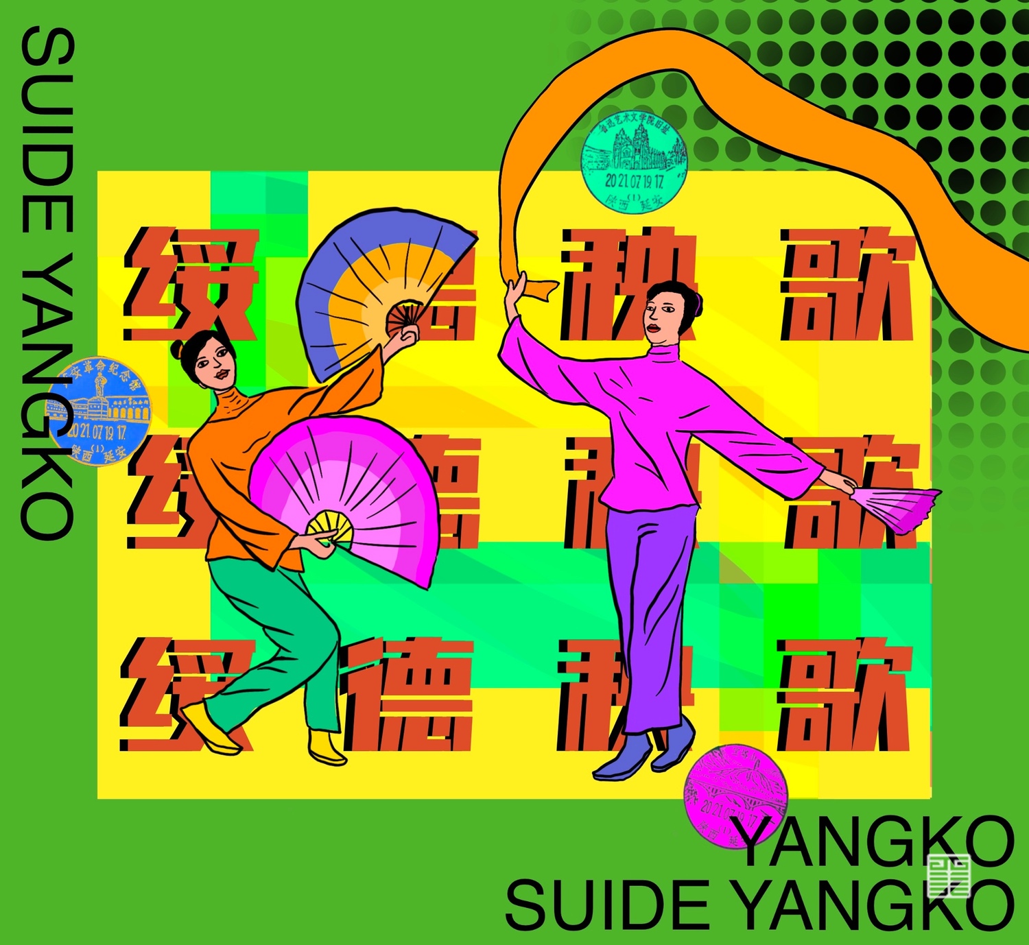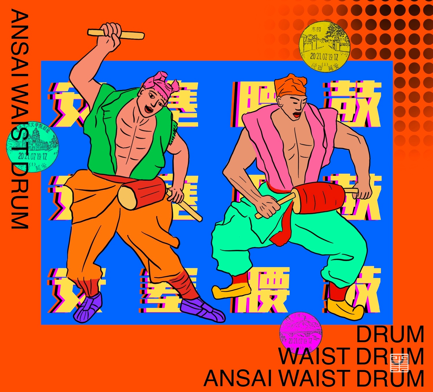 作品3-5: 本作品集合了陕北的特色民俗文化:安塞腰鼓,绥米唢呐,绥德秧歌,根据陕北当地的雕塑形象进行颜色设计和文字排版。