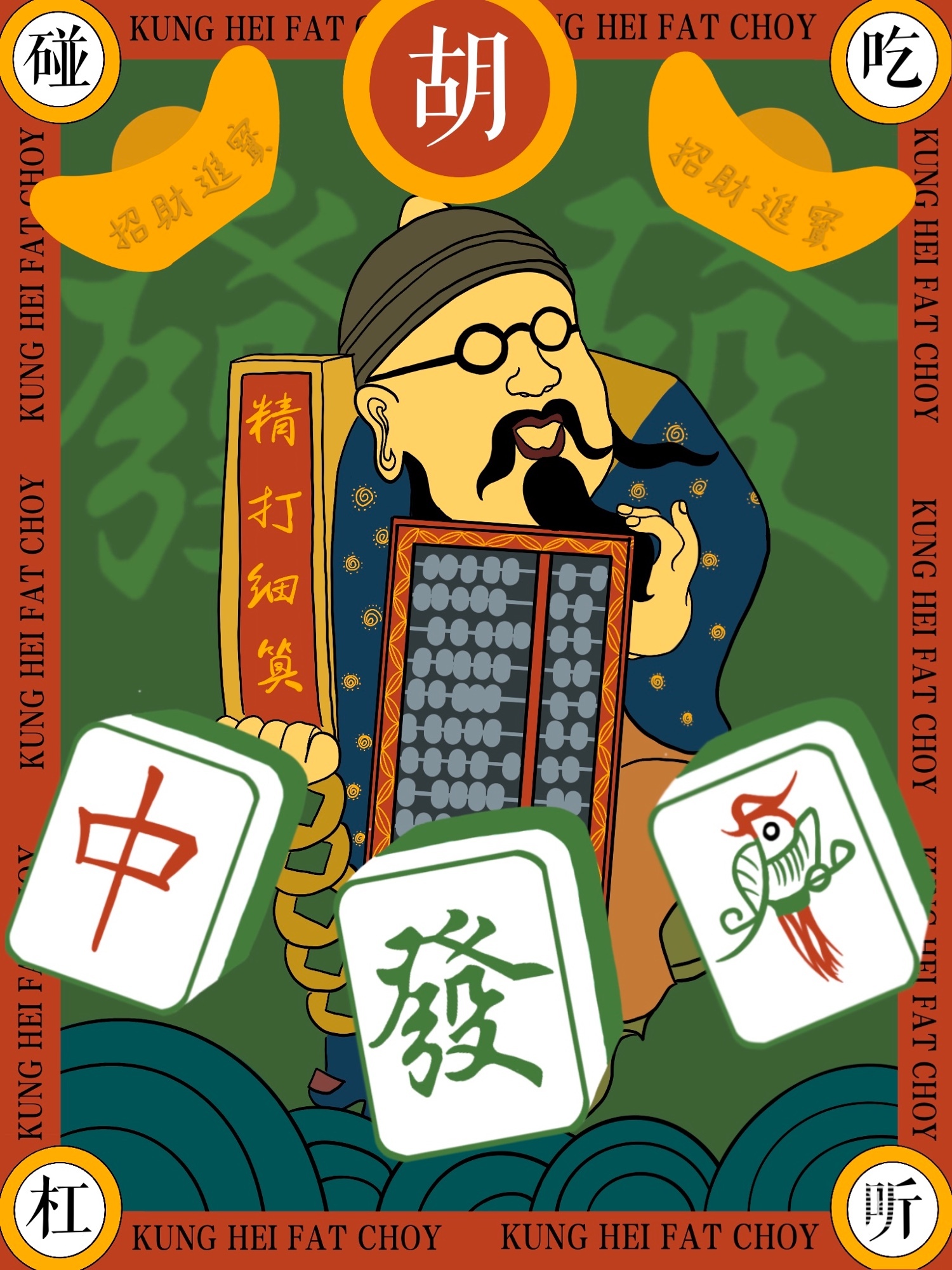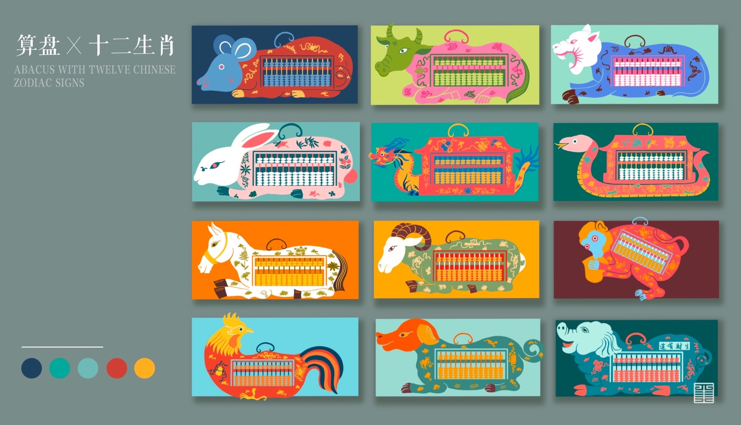 作品2: 本作品灵感来自于榆林算盘博物馆展出的一组十二生肖形状的算盘,结合展品的形态特点进行了颜色搭配等设计。