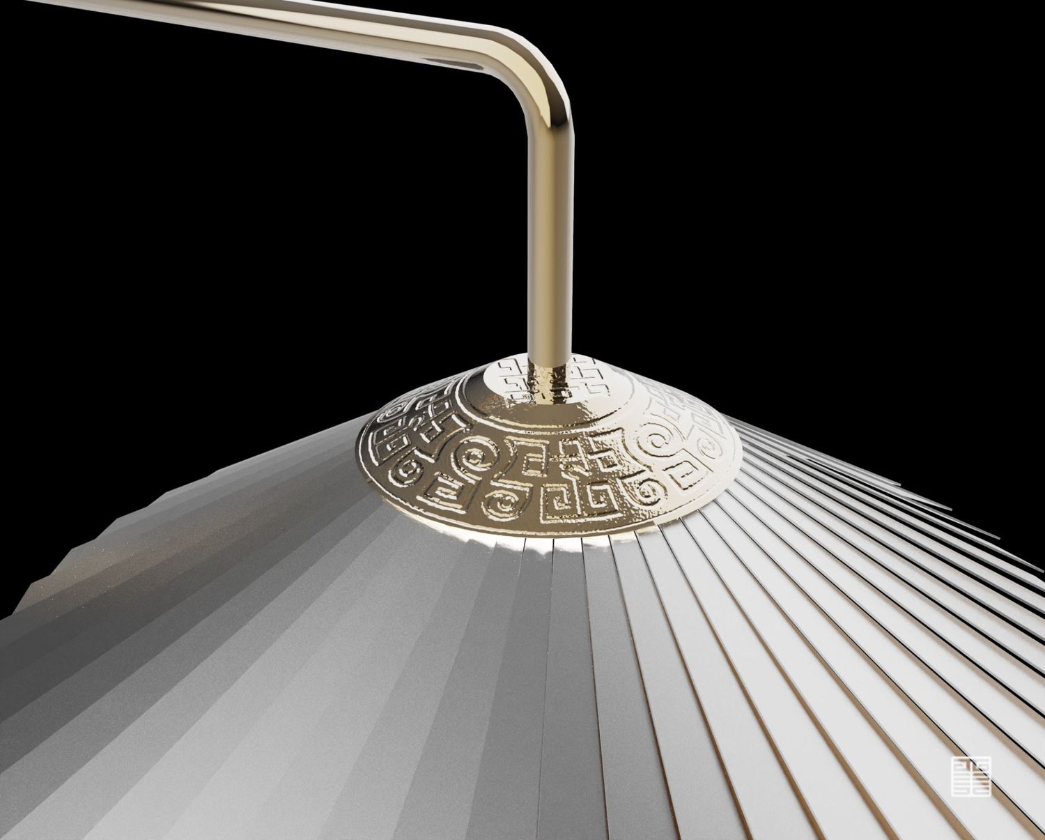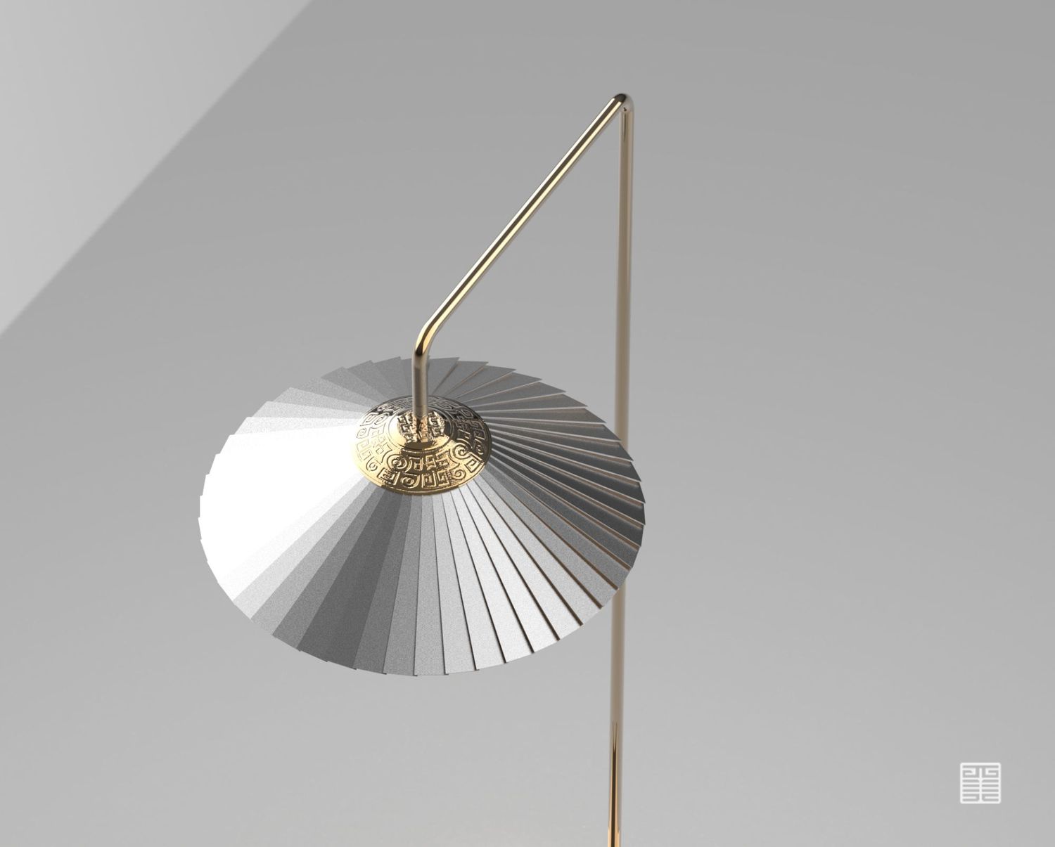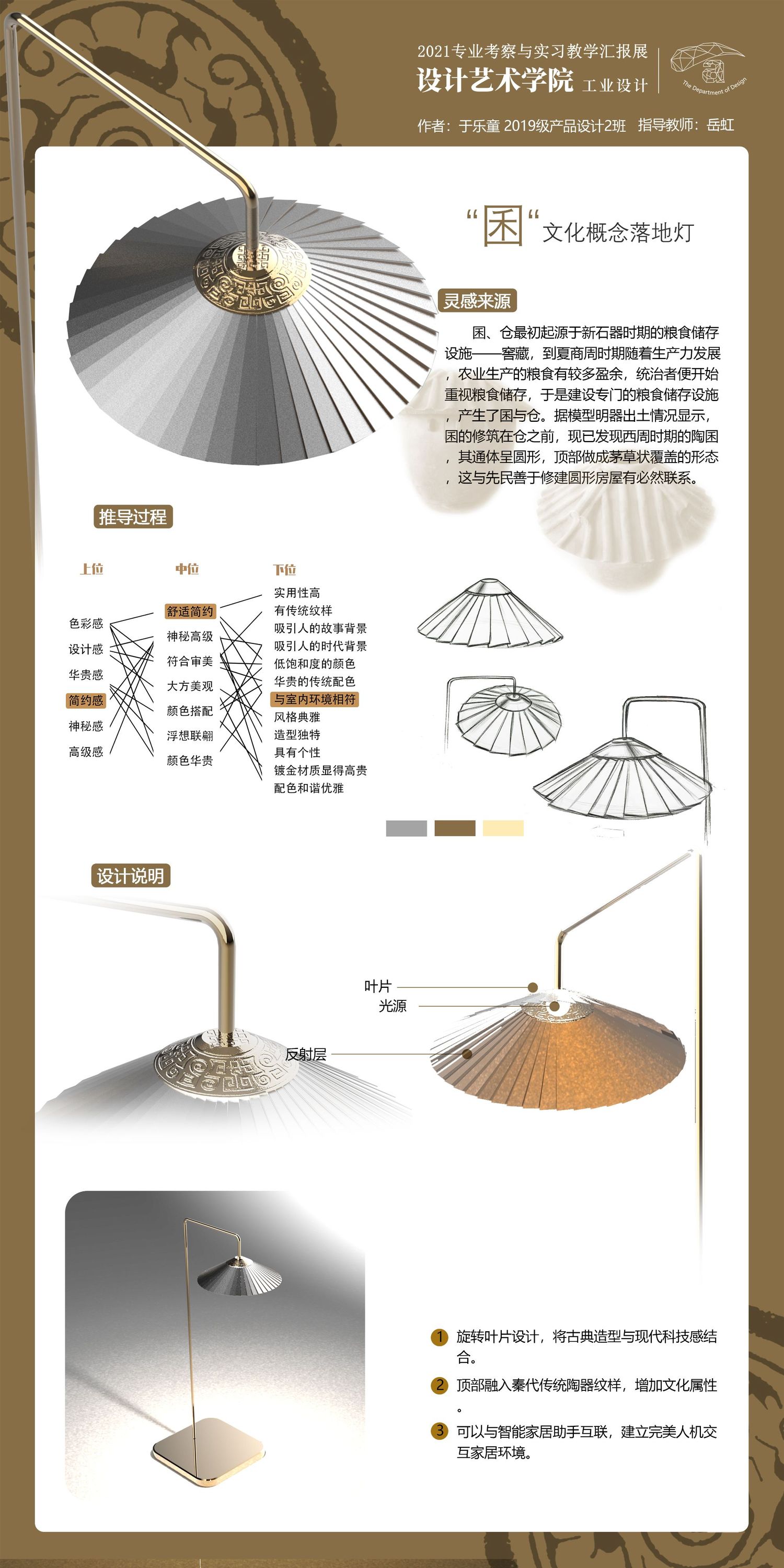 该落地灯采用旋转叶片设计,将古典造型与现代科技感结合。 顶部融入秦代传统陶器纹样,增加文化属性。可以与智能家居助手互联,建立完美人机交互家居环境。