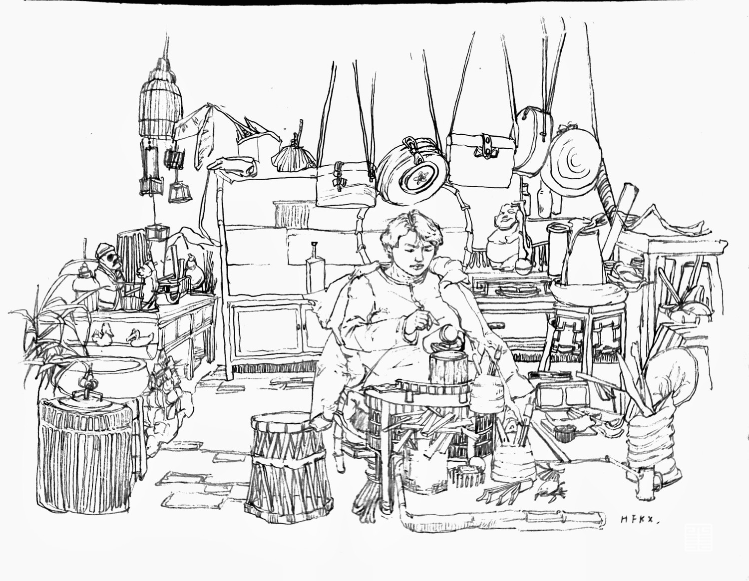 写生期间,在深刻体会袁家村的风土人情后,我认为,最吸引我的一种美就是人文之间的烟火气所以我总喜欢加入这些自然而又舒展的人物,她们和袁家村好像有某种共振,眉眼柔和简单纯粹。在传统文化和商业的自然衔接中,她们和周围的仿古建筑逐渐相融在步行街的喧嚣中格外闲适,那一刻,总觉得需要记录些什么。