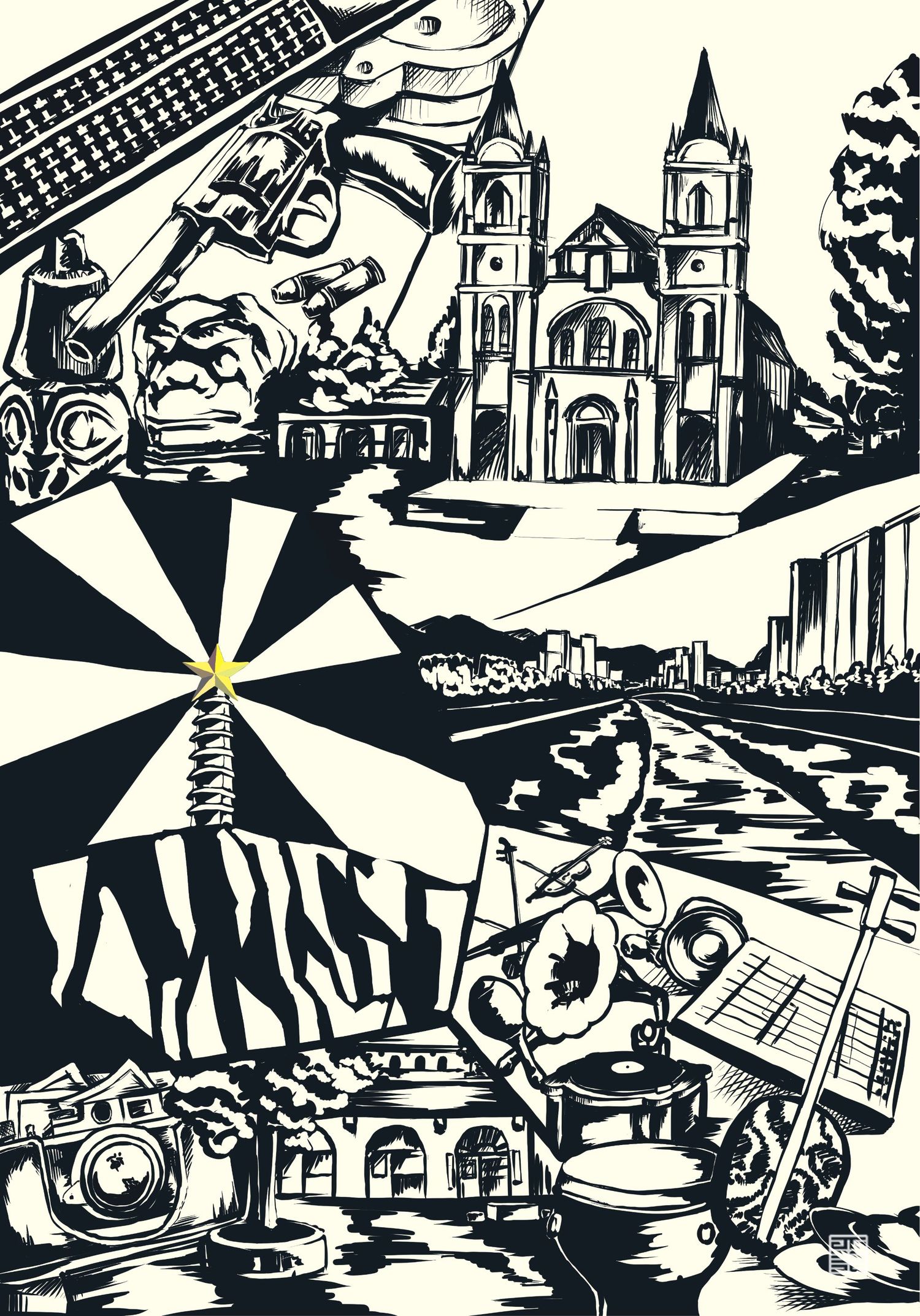 大致用了宝塔山等革命相关元素和民乐乐器等有代表性的艺术元素完成了整幅作品,以此来表达广大人民群众与红色革命精神之间的一种联系。