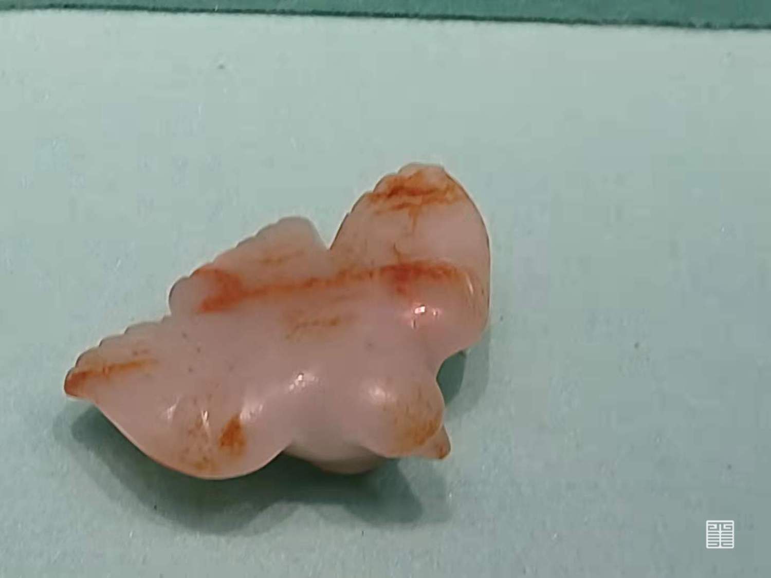 相较于总是摆着一张臭臭脸庞的饕餮纹,另一件馆藏文物更加惹人喜爱。那是一件小圆雕。白底玉石上留有几缕黄色石皮,恰到好处的放在了羽毛的纹理处,在增加美观度的同时,提升了可爱程度。圆鼓鼓的小肚皮贴着展柜平面,两个翅膀并列张开,翅膀尾部和尾羽平行。憨态之中不难可见,雏鹰长成后,翱翔天际间的矫健。玉鹰发现于汉元帝渭陵“长寿宫,寓意为帝陵汉元帝时期安全的护卫者。